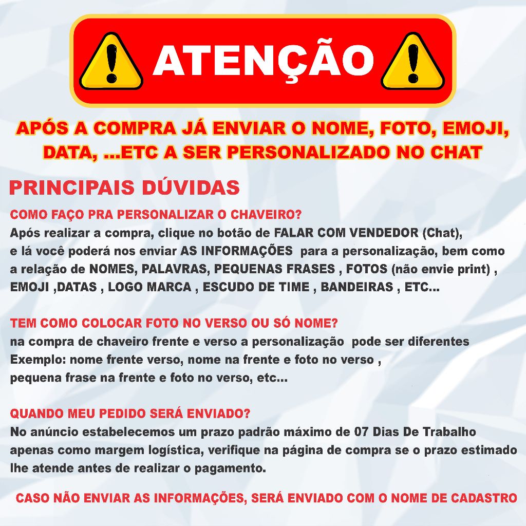 Sob encomenda: envio após 7 dias da compra