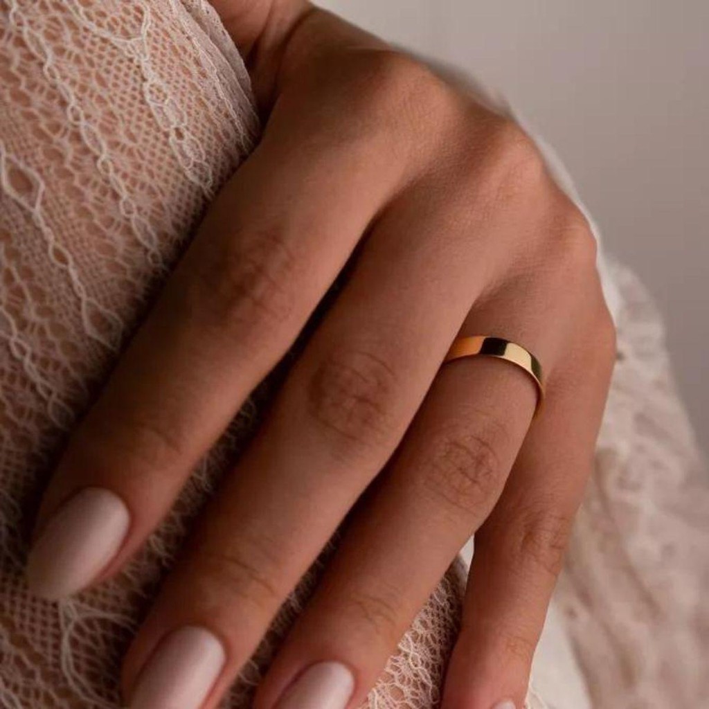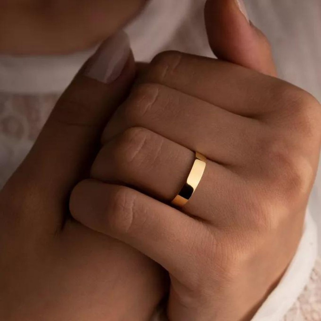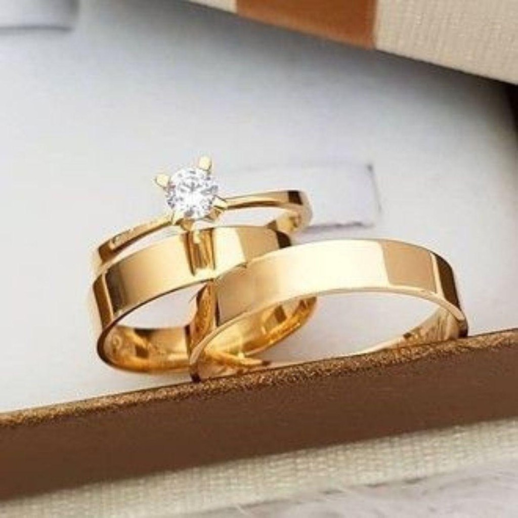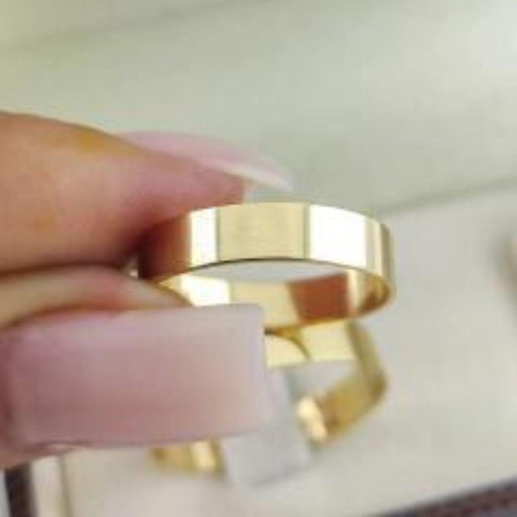 Aliança de Casamento 4mm Reta + Anel Solitário Zircônia Par de Alianças Noivado Banhada Aço Inoxidável 316L Cor Ouro 18k