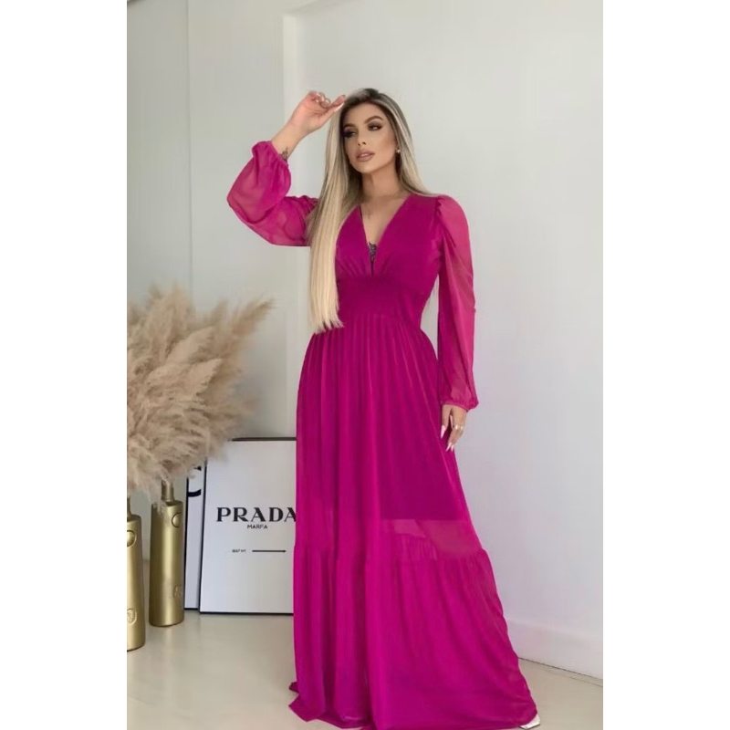 Vestido Feminino de Tule Longo com Manga Longa para Festa/Casamento/Noivado