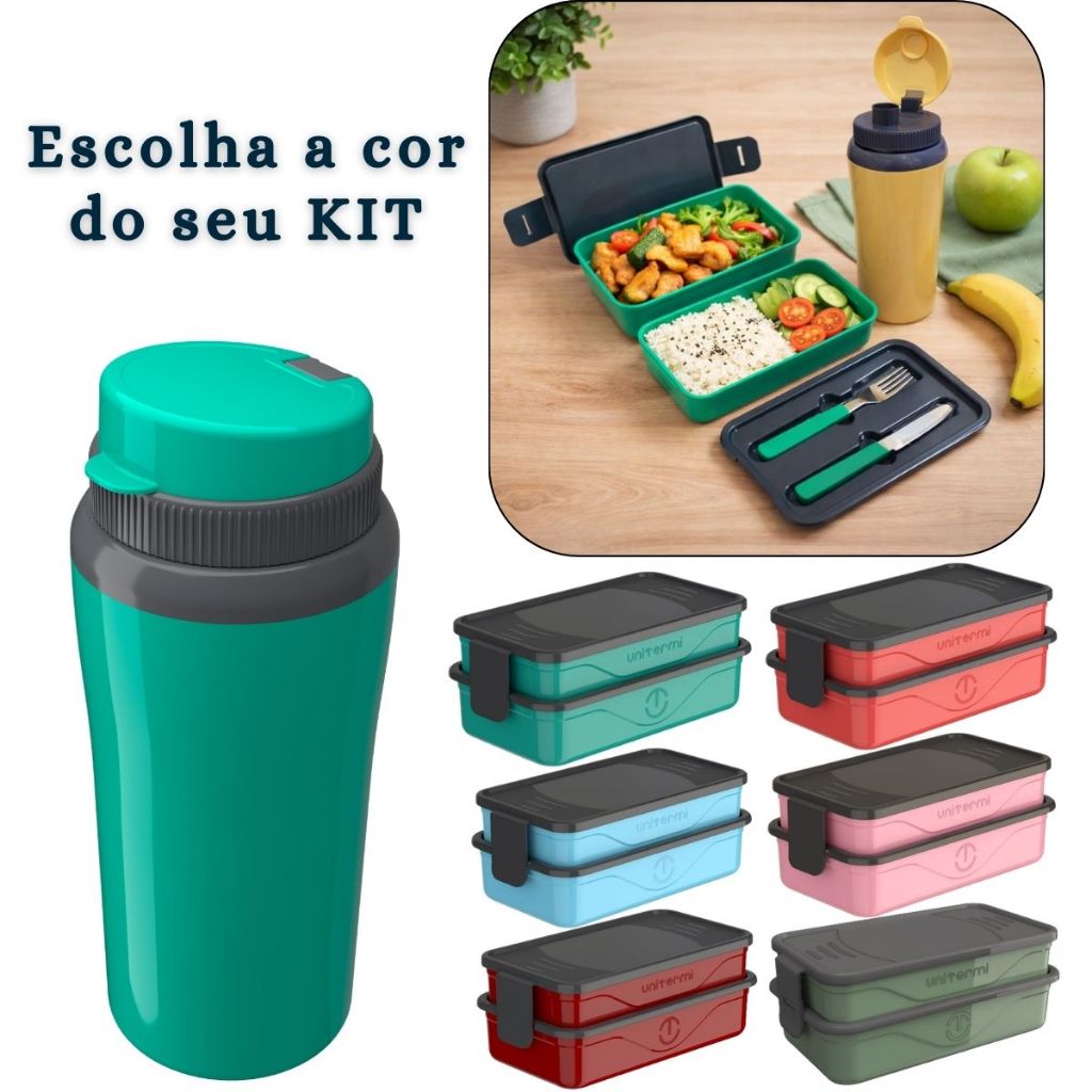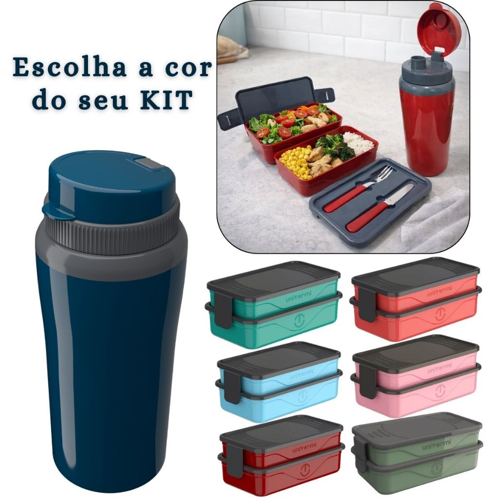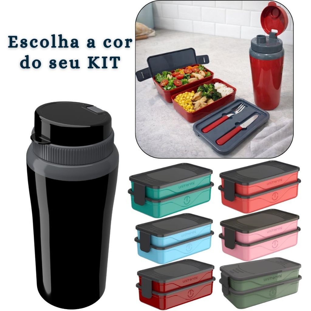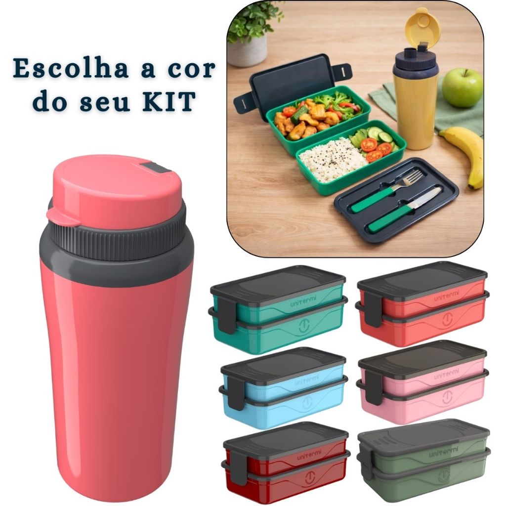 Kit Marmita Fit Unitermi Talheres Divisórias Copo Térmico Miami 650ml Tampa Parede Dupla Squeeze