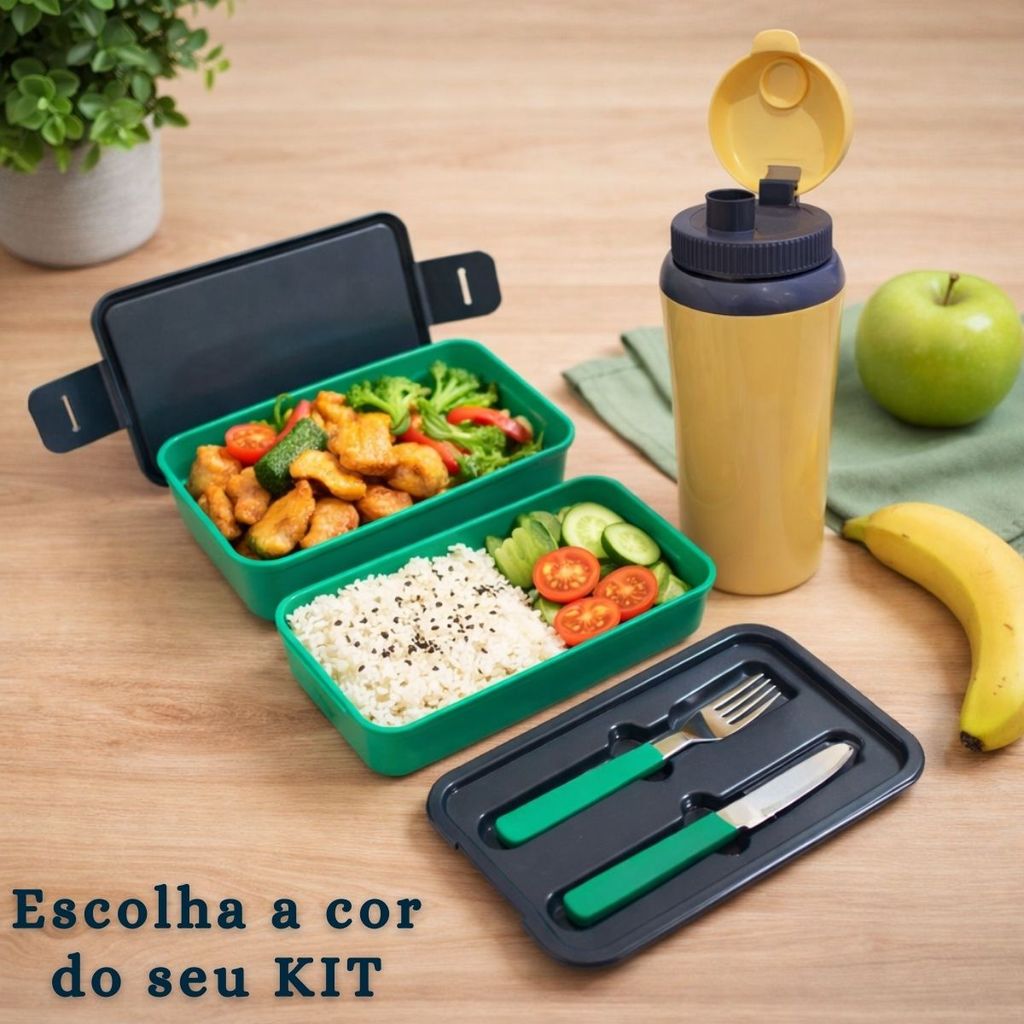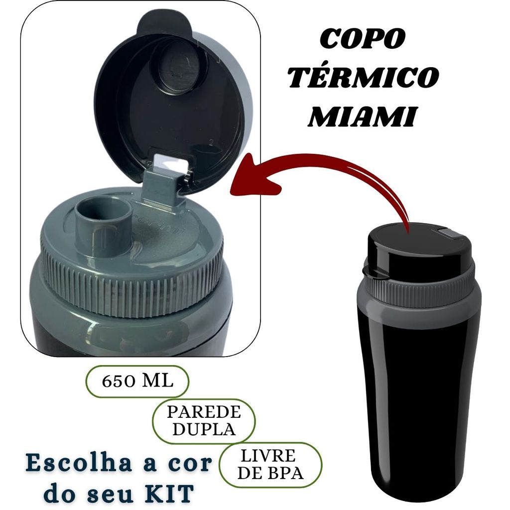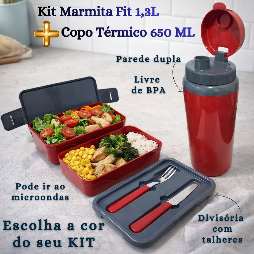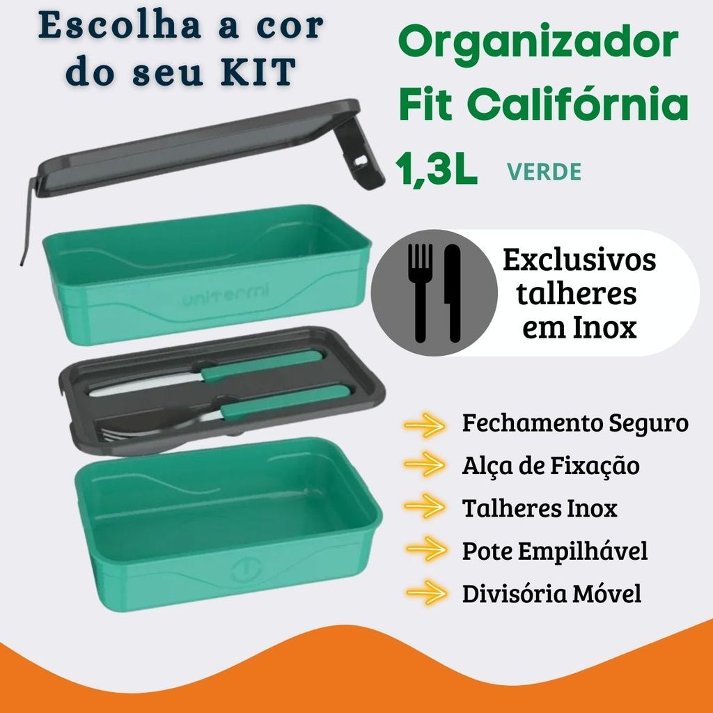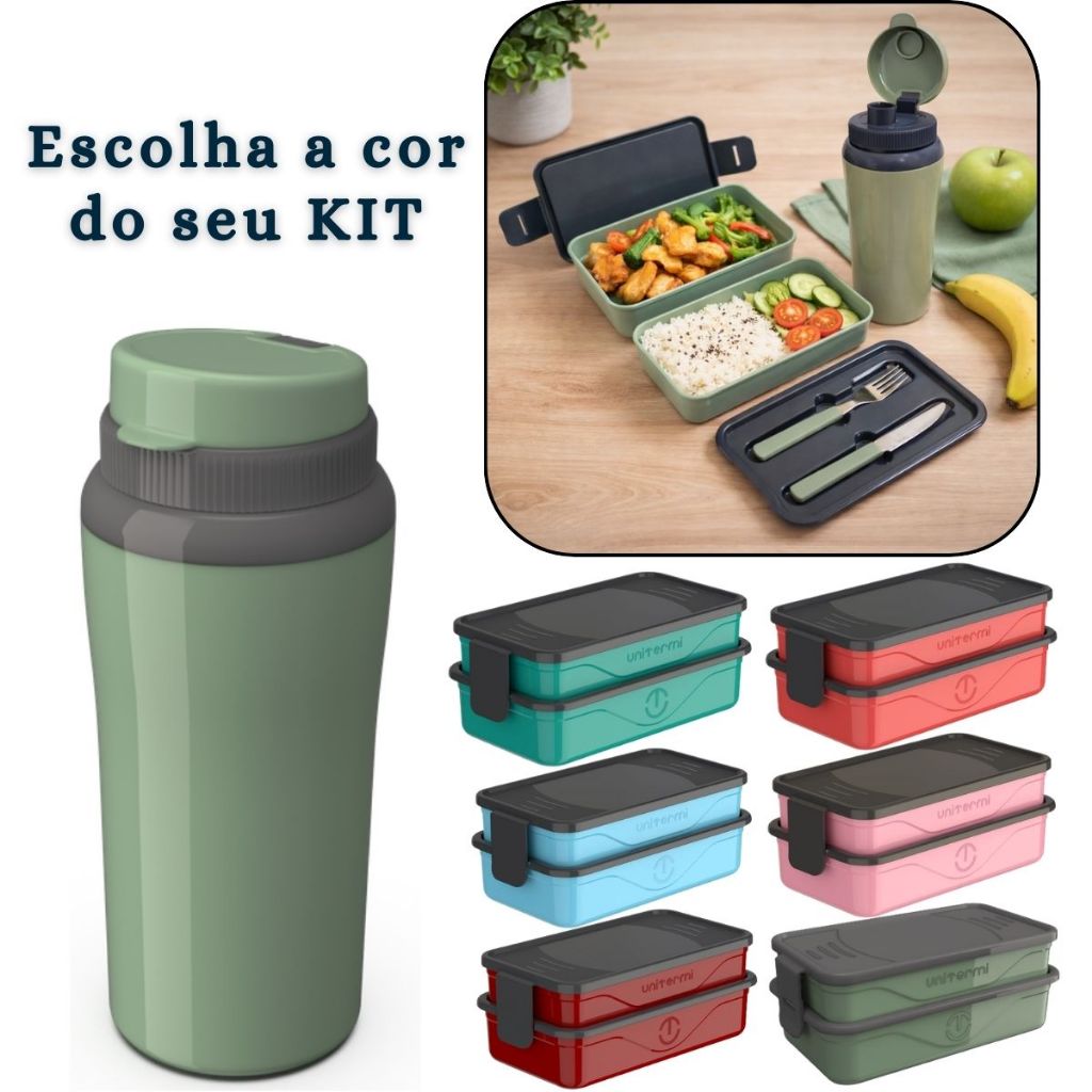 Kit Marmita Fit Unitermi Talheres Divisórias Copo Térmico Miami 650ml Tampa Parede Dupla Squeeze
