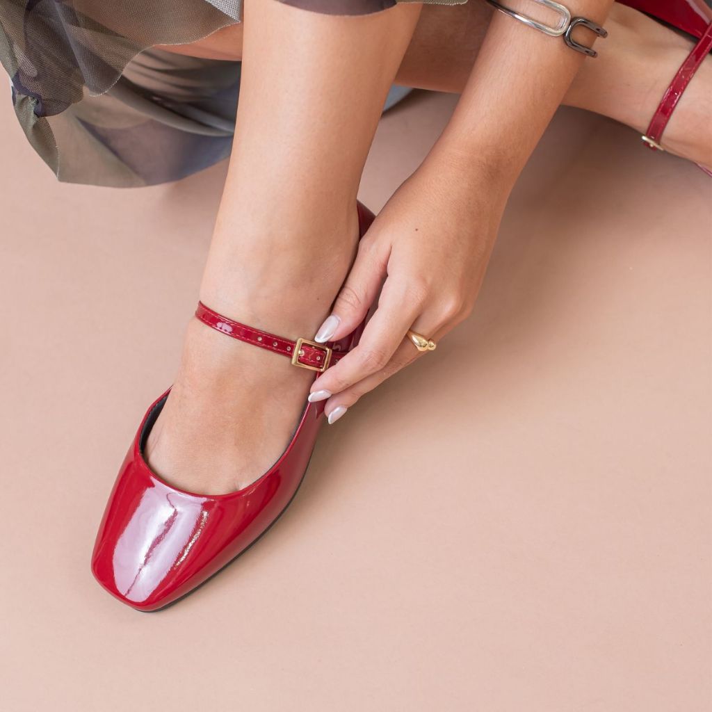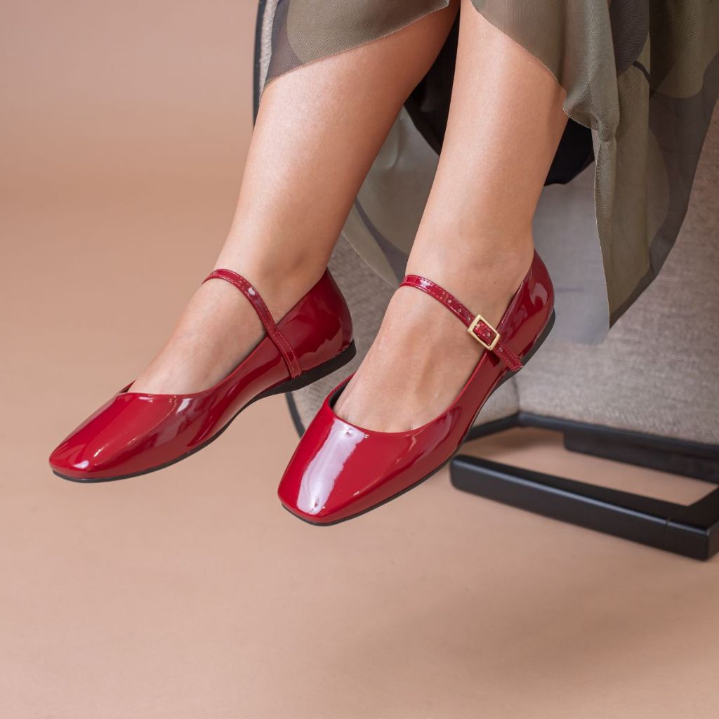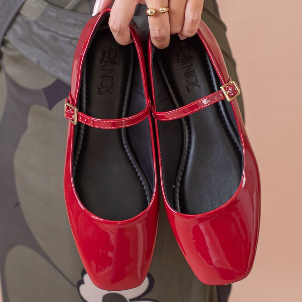 Sapatilha Verniz Feminina Elegante Boneca Conforto e Estilo para Dia a Dia Bico Quadrado Retro Cherry