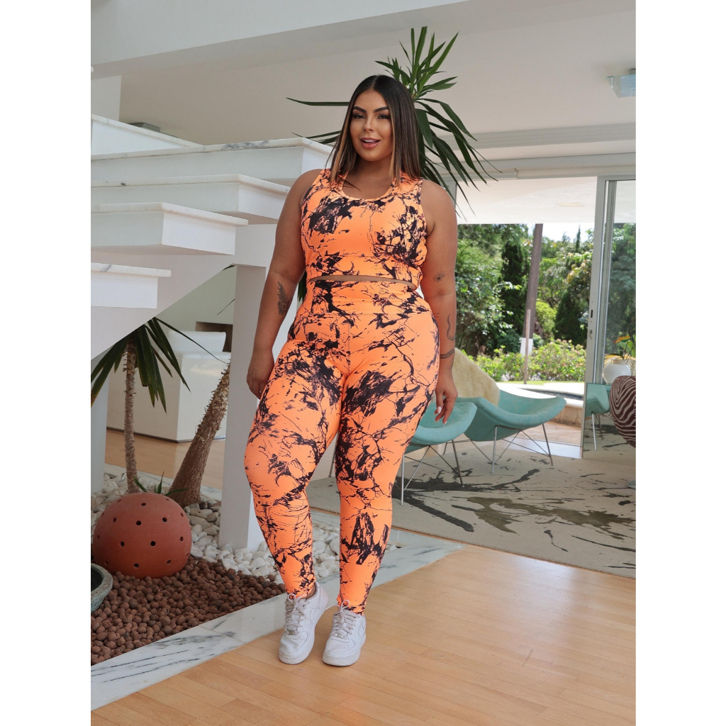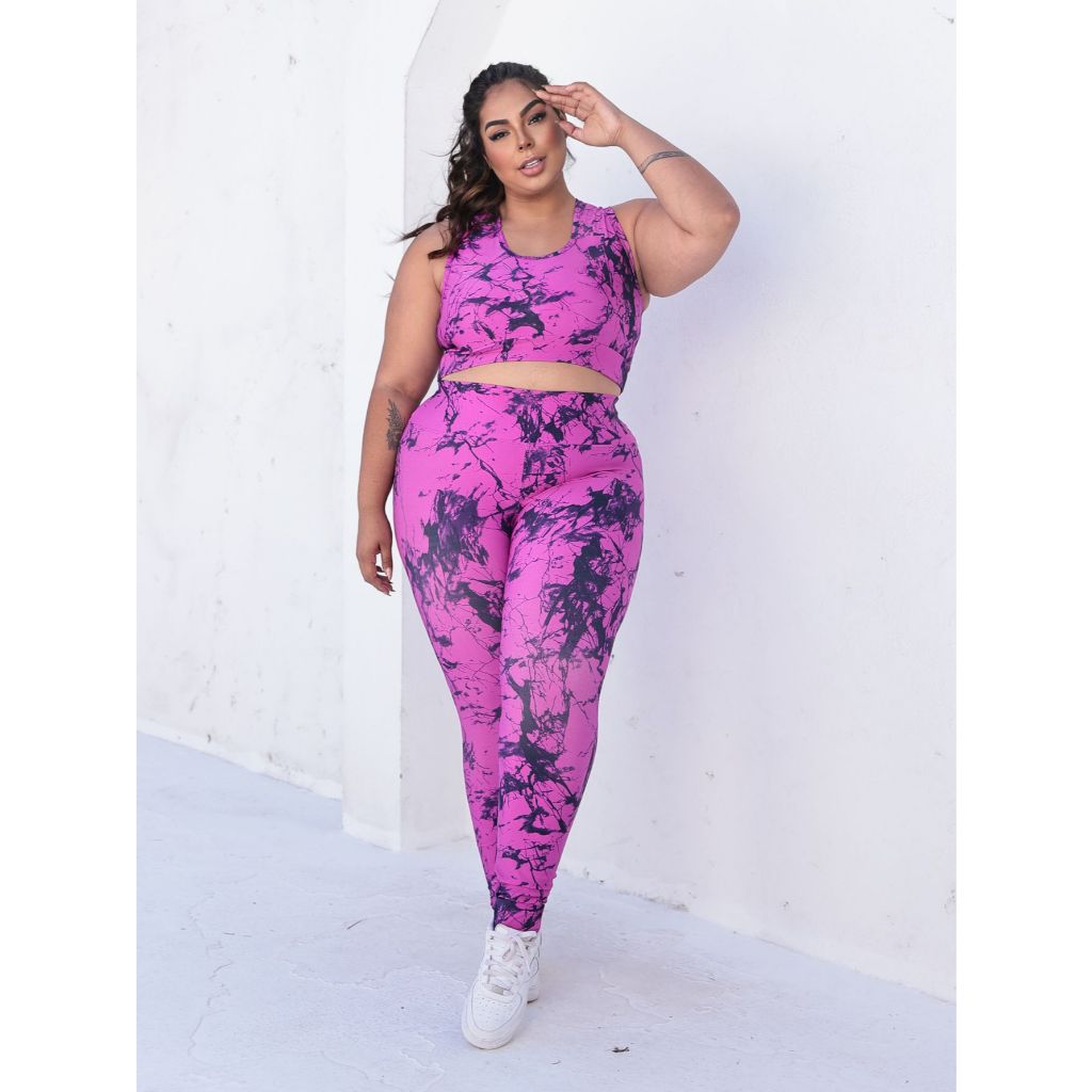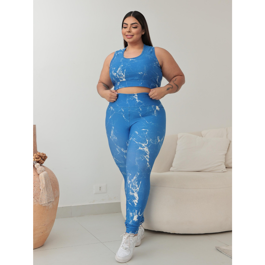 Conjunto Fitness Academia Plus Size Marmorizado Feminino – Top Nadador + Legging Cintura Alta