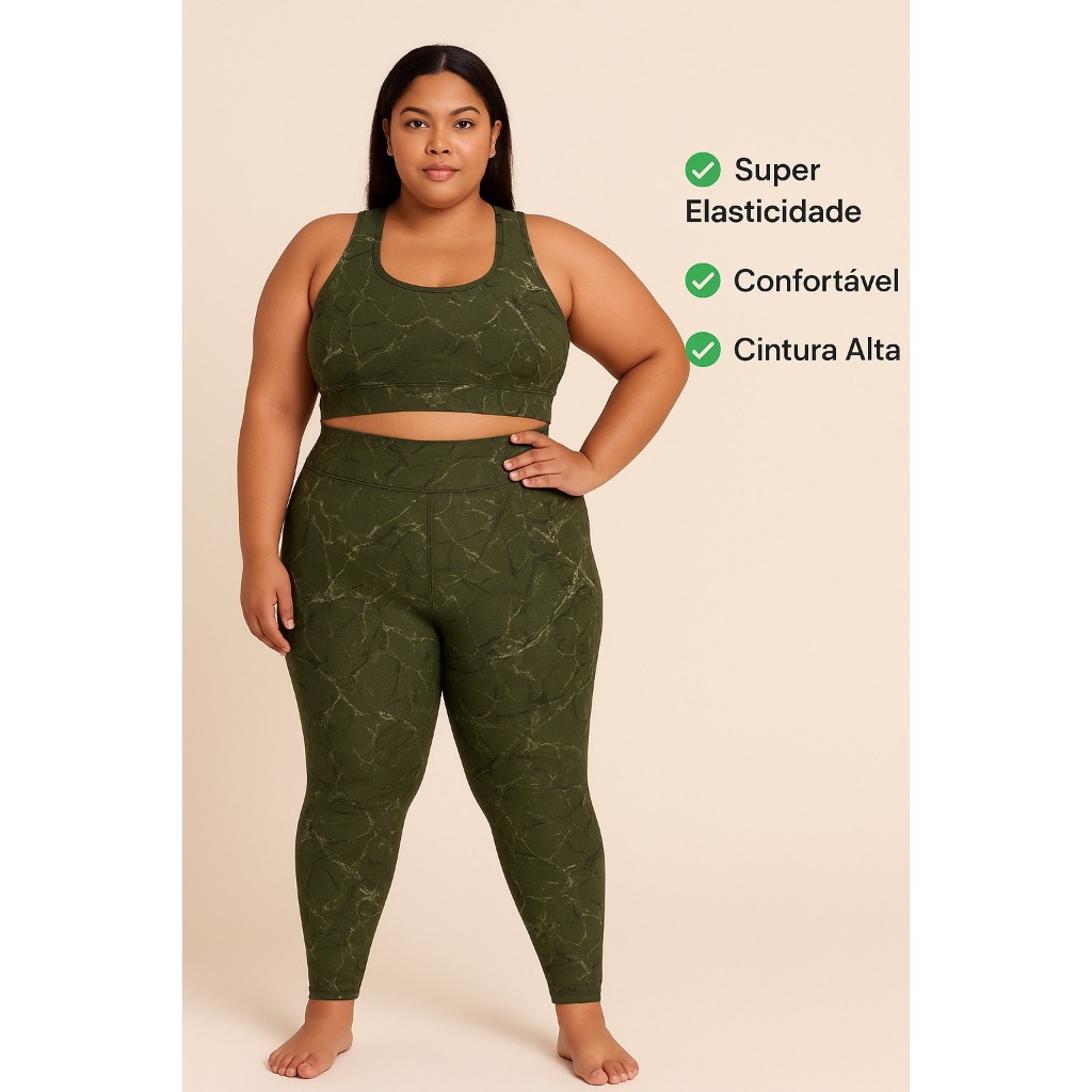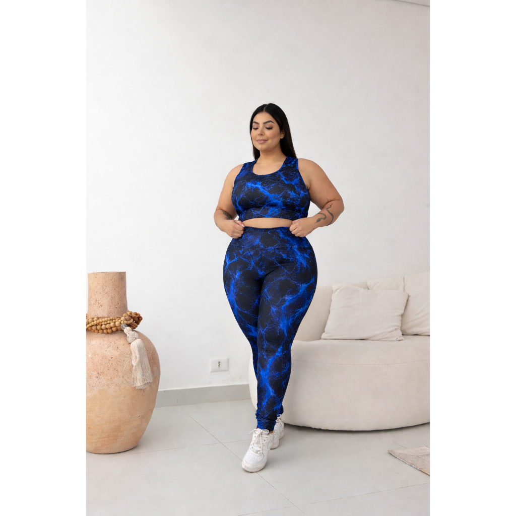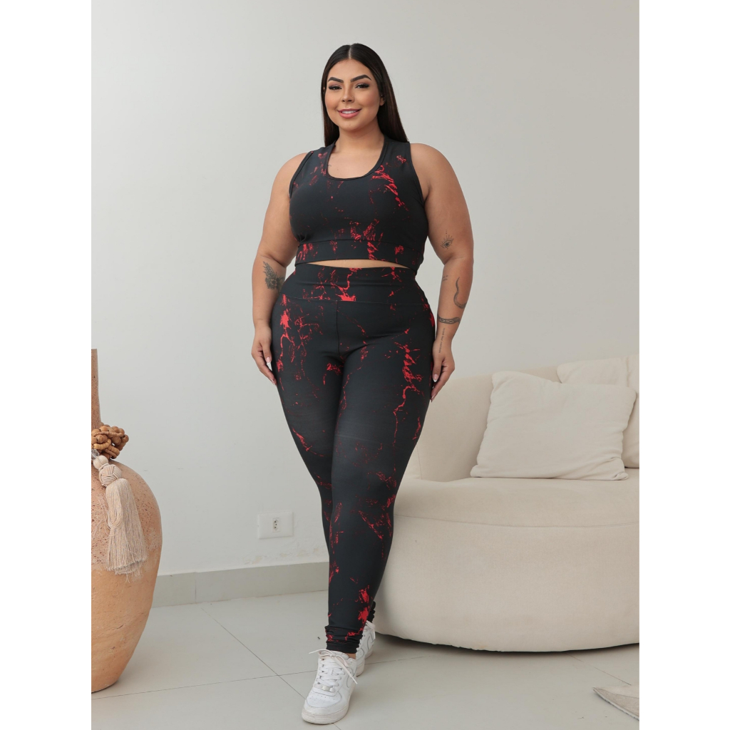 Conjunto Fitness Academia Plus Size Marmorizado Feminino – Top Nadador + Legging Cintura Alta