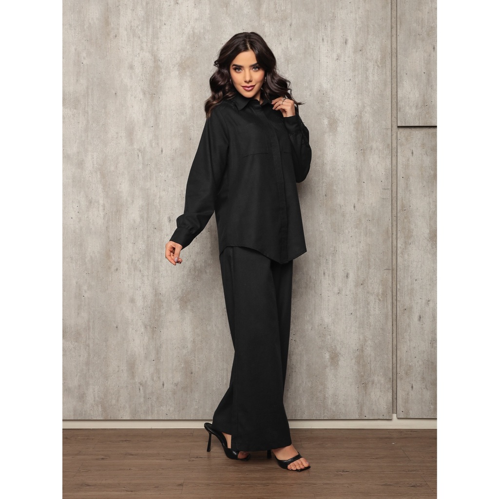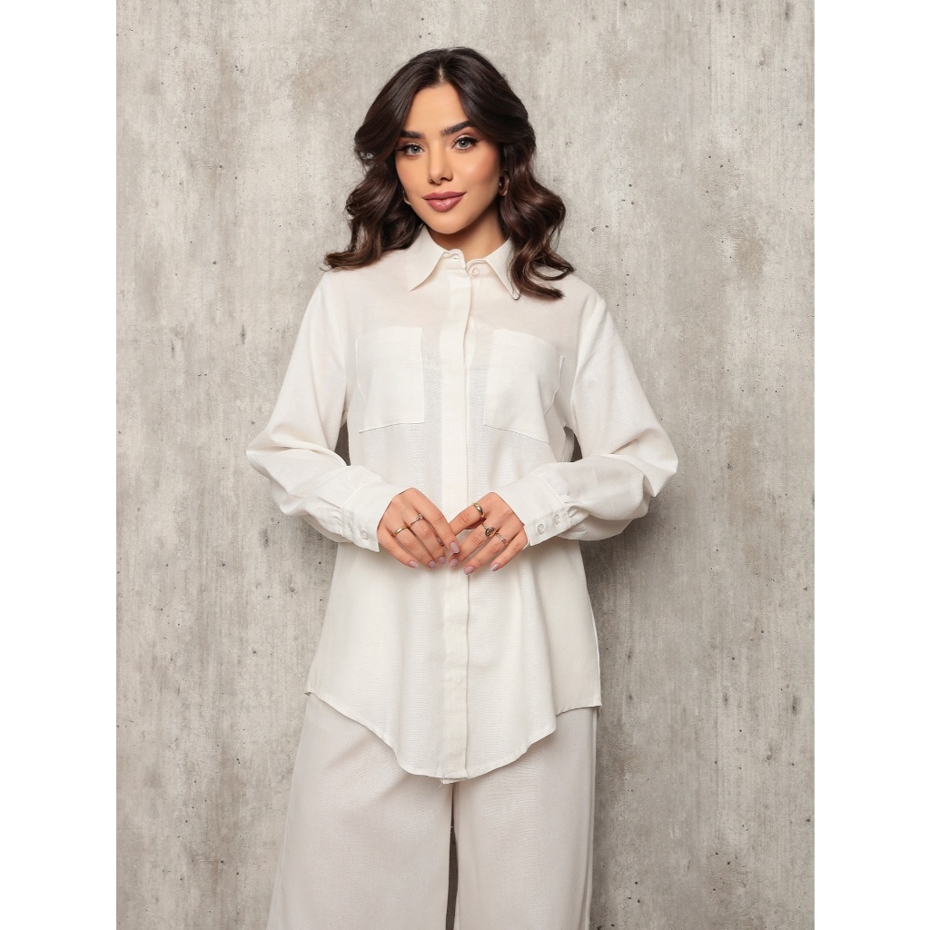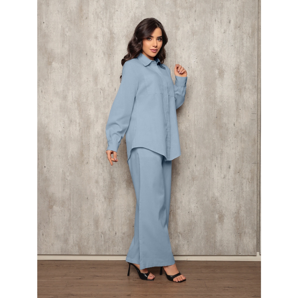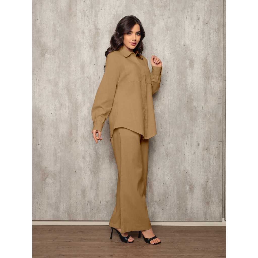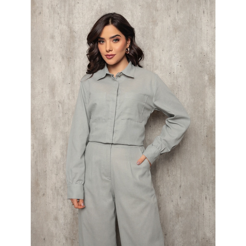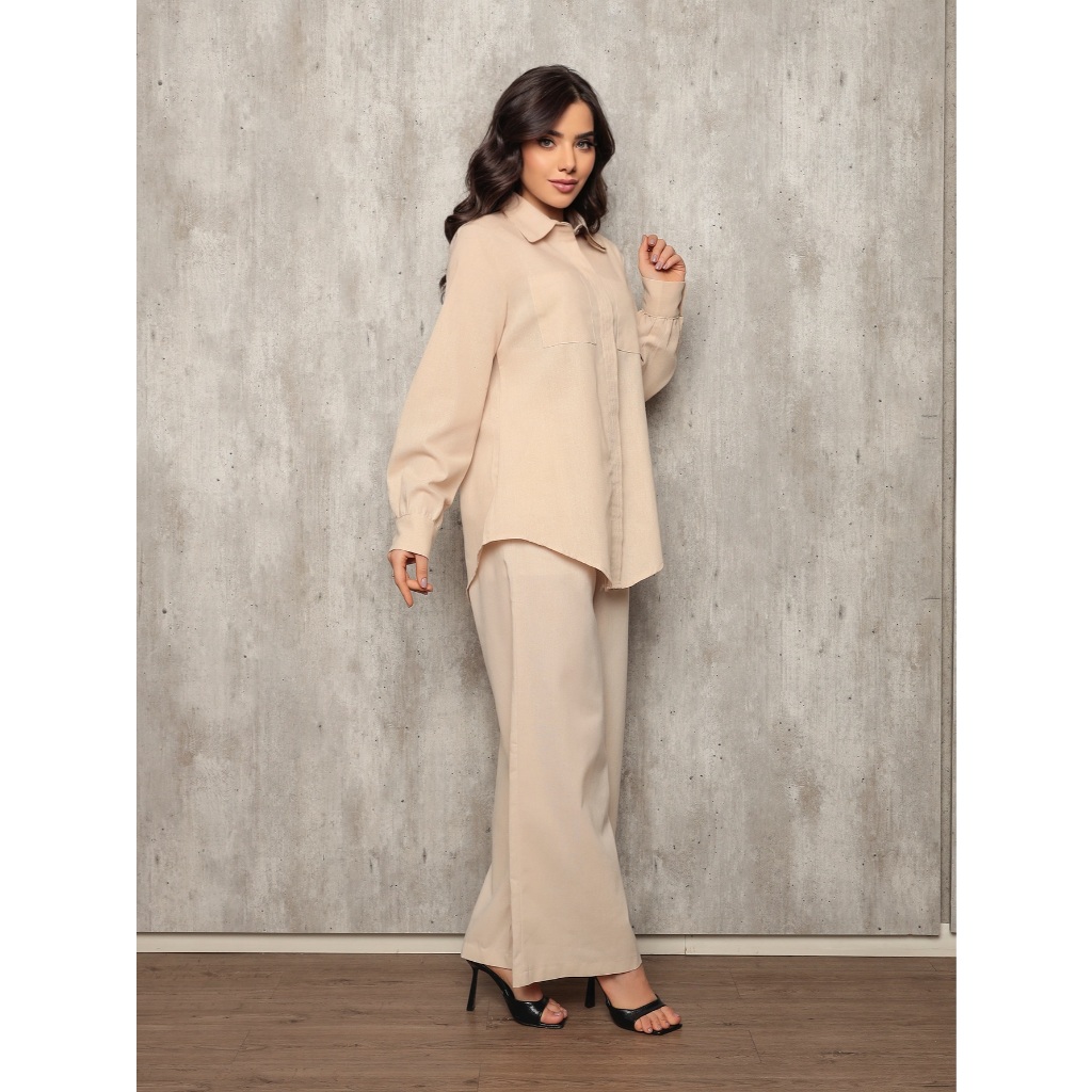 Conjunto 8026 camisa e calca pantalona tecido linho com bolso frontal e lateral barra redonda