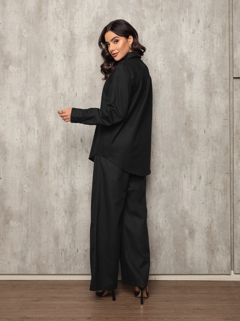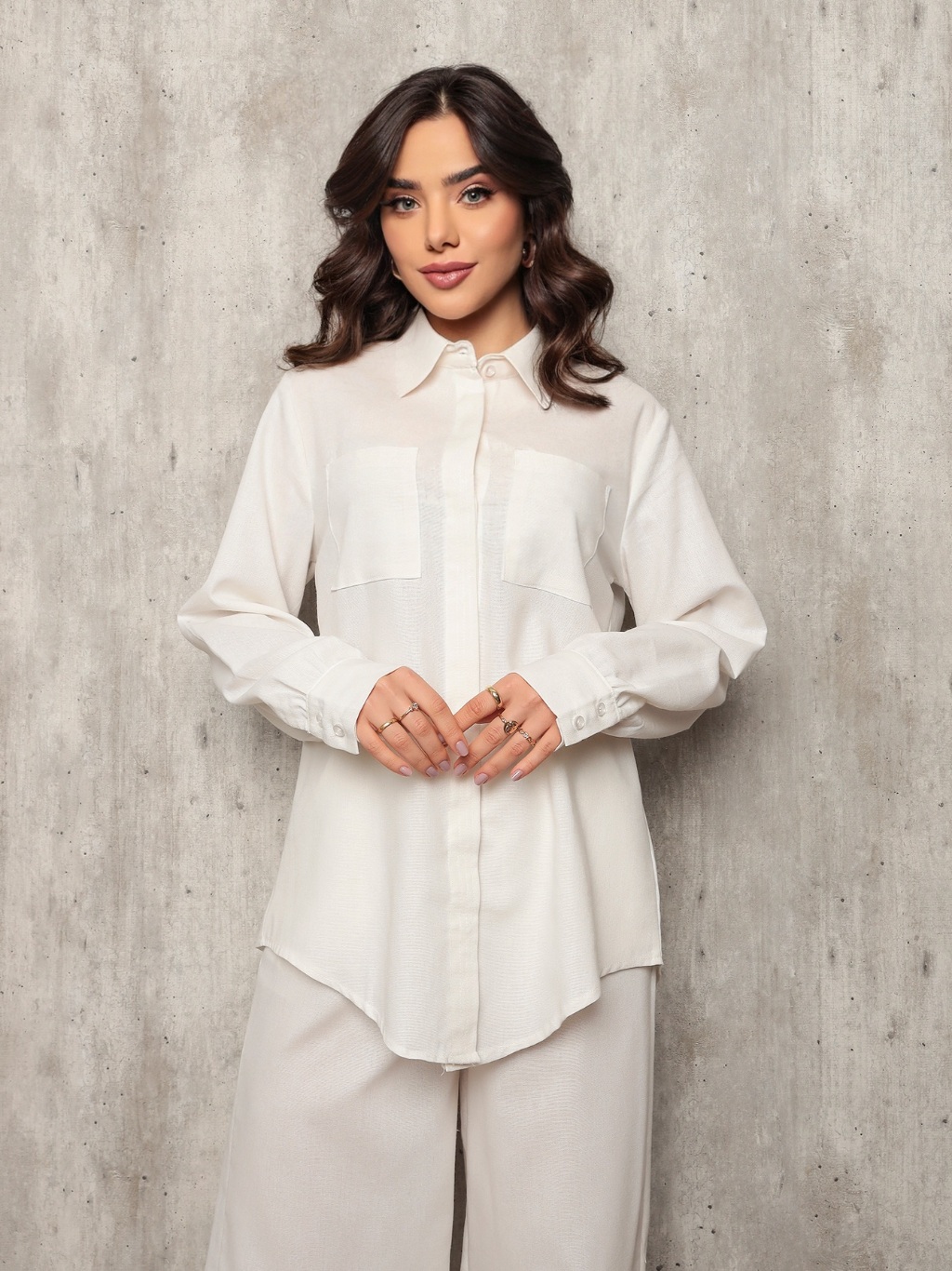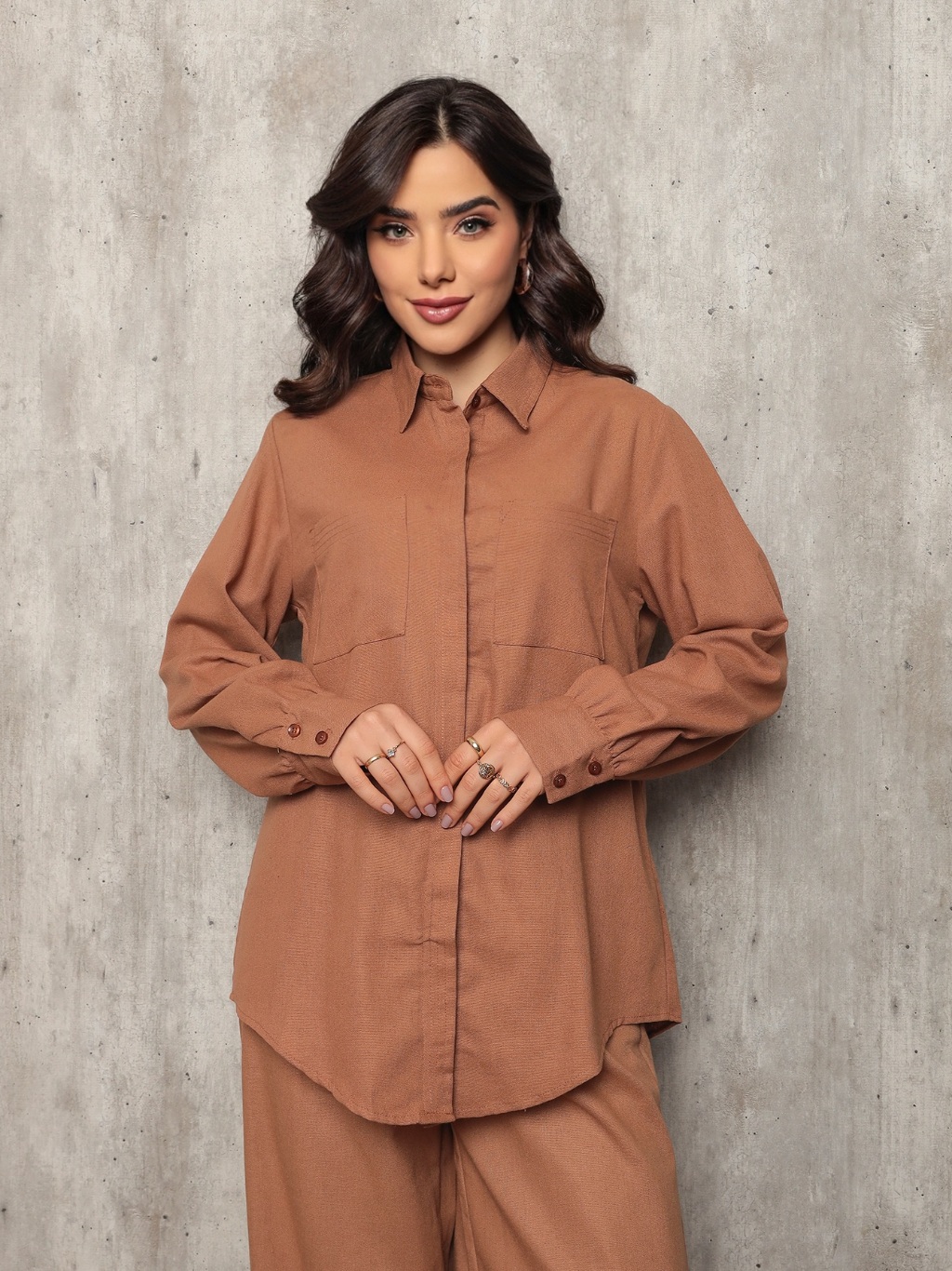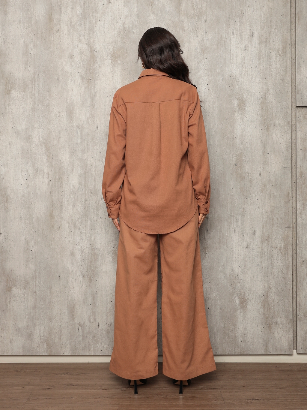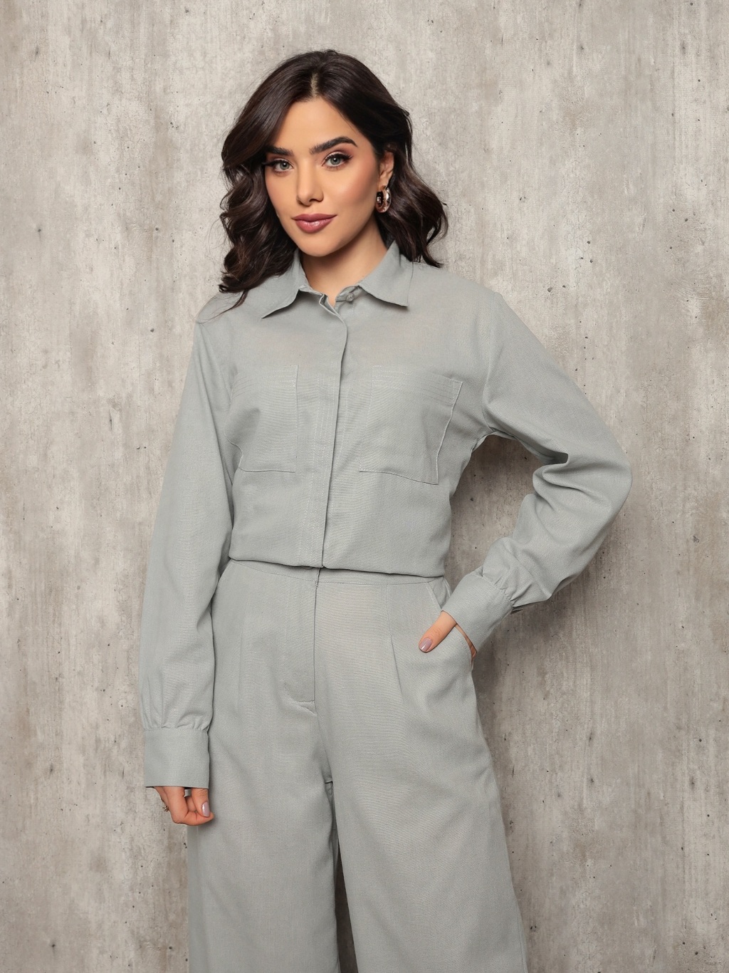 Conjunto 8026 camisa e calca pantalona tecido linho com bolso frontal e lateral barra redonda