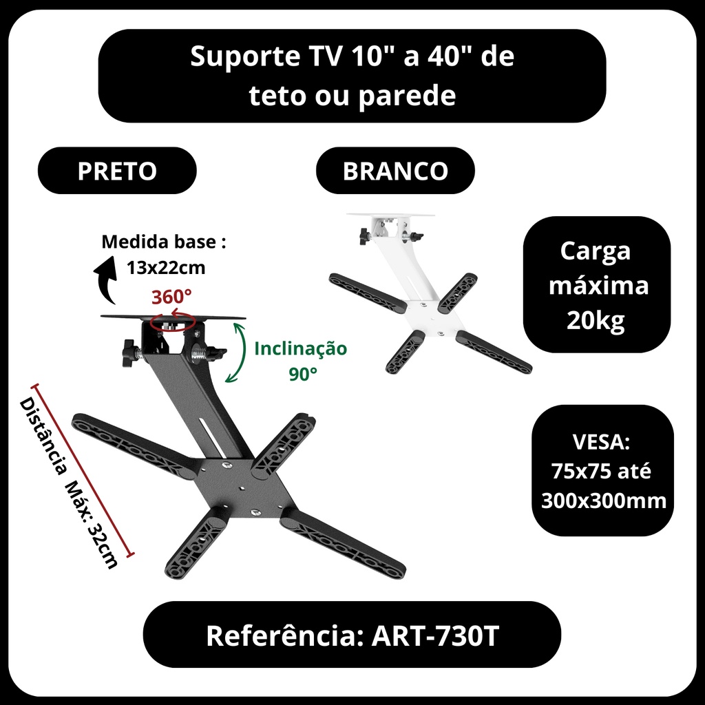 SUPORTE DE PAREDE PARA TV PARA TETO 10 A 40 POLEGADAS COM INCLINAÇÃO