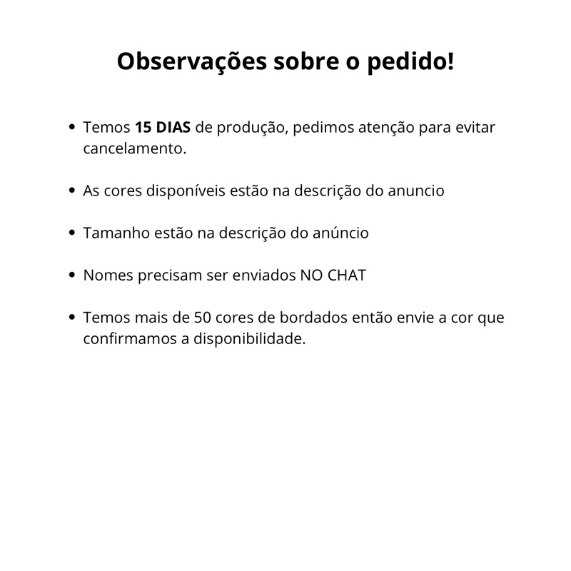 Sob encomenda: envio após 15 dias da compra