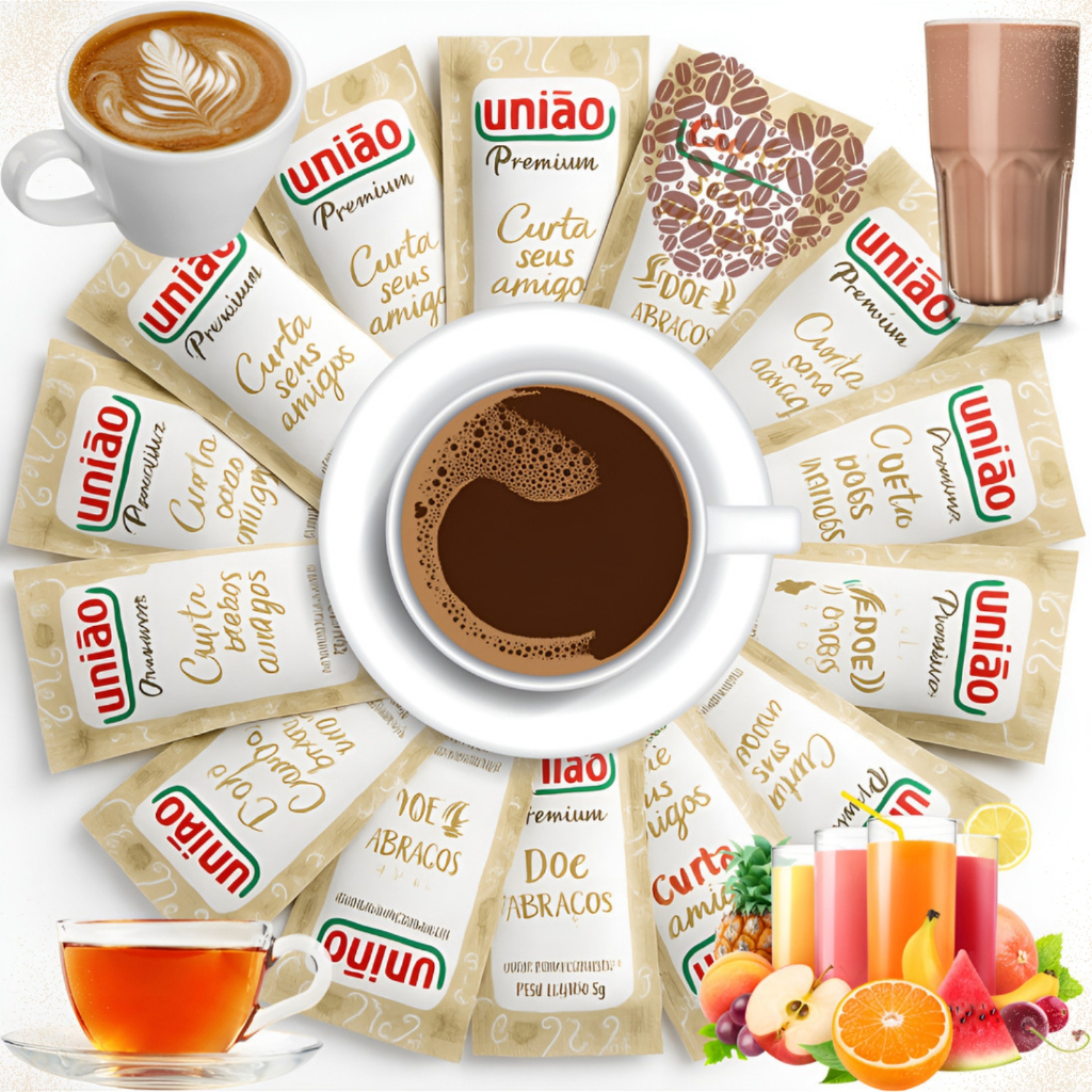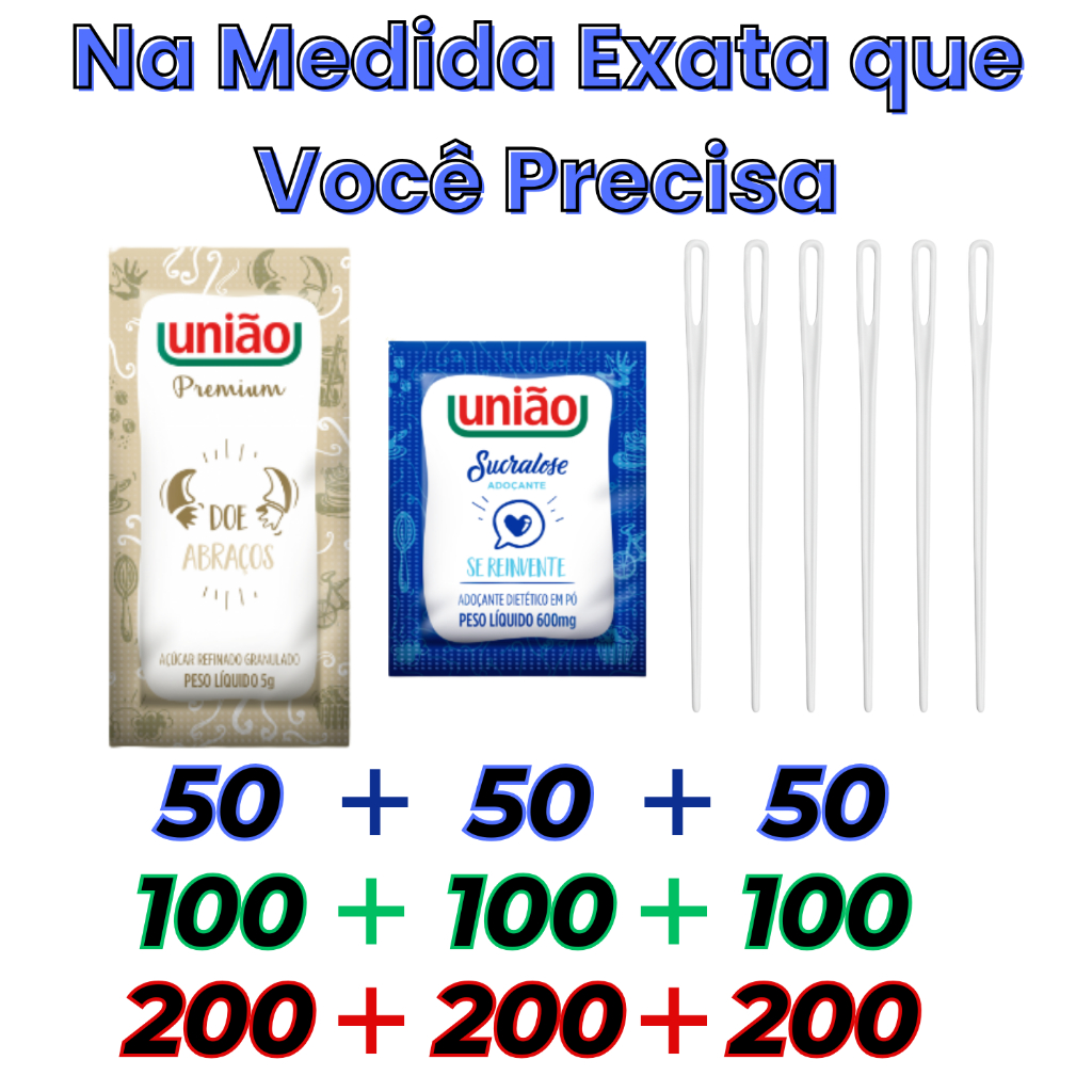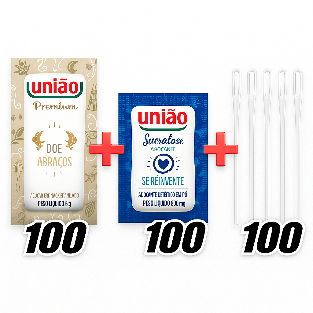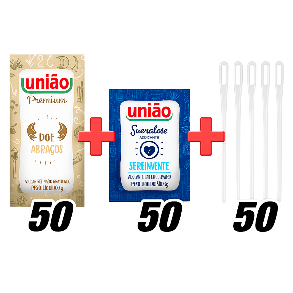 Kit Açúcar Sache União + Adoçante Sachê Sucralose + Mexedor p/ Café | Escolha 50, 100 ou 200 unid
