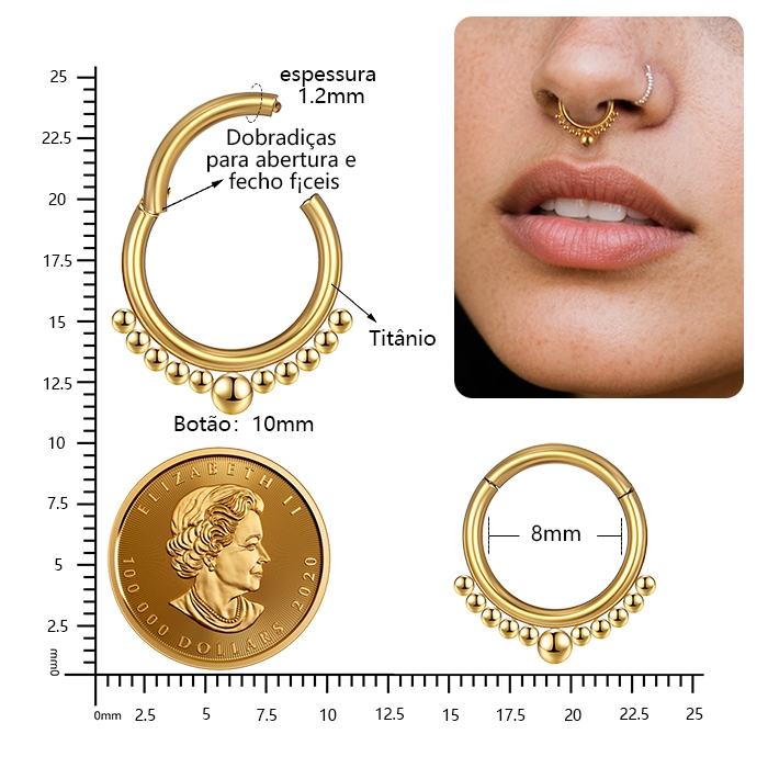 Piercing Septo Rook Conch Nariz Argola Titânio G23 PVD Segmento Articulado Bolinhas