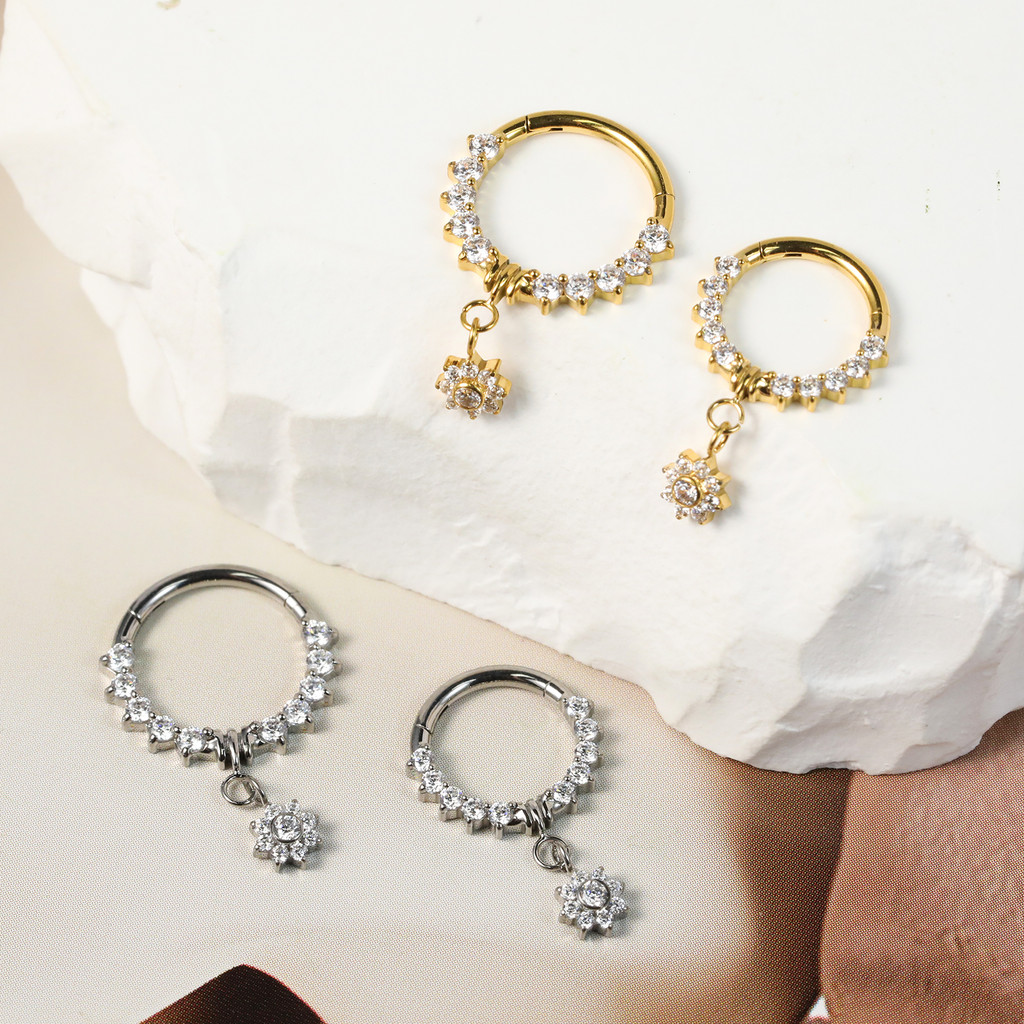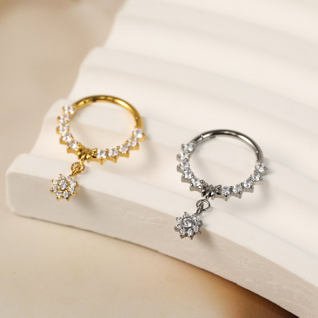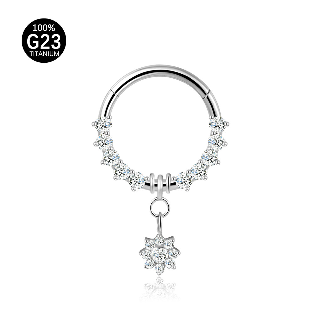 Piercing Argola Titânio Septo Rook Conch Segmento Articulado Zircônia Frontal Com Pingente Flor