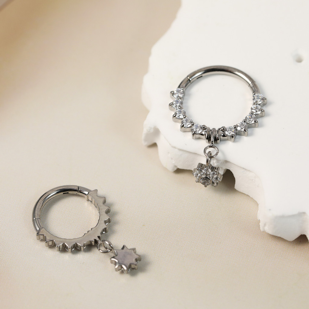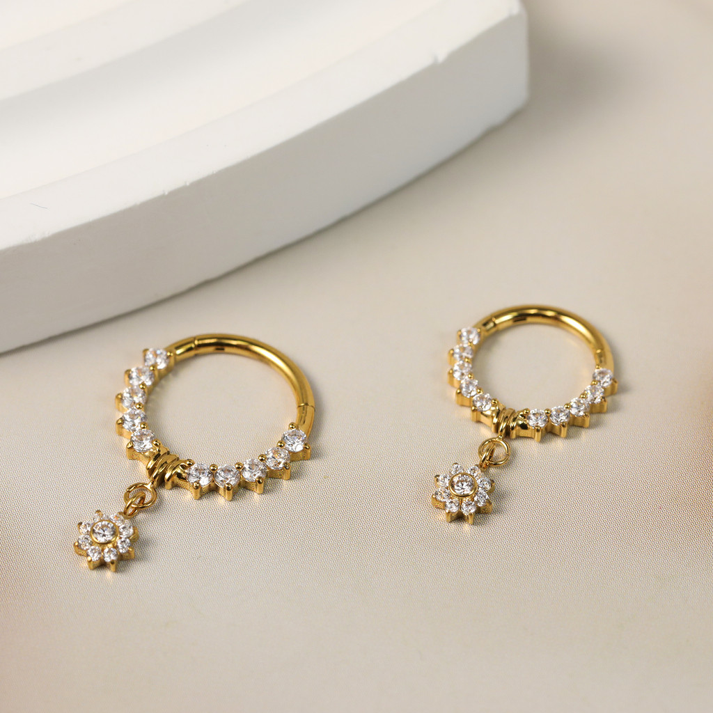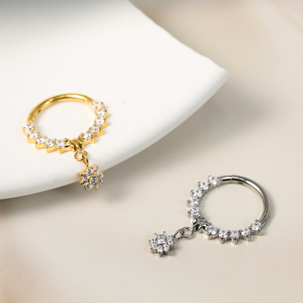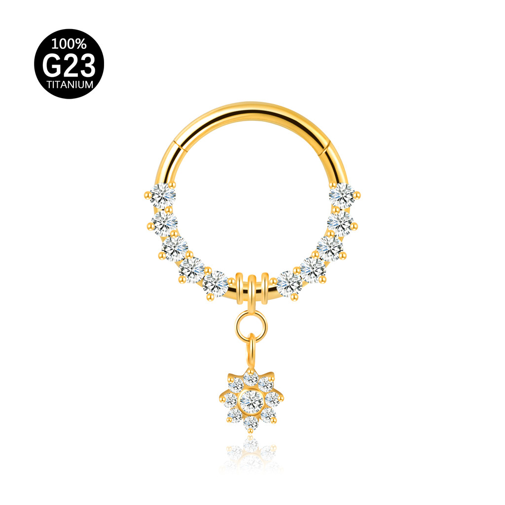 Piercing Argola Titânio Septo Rook Conch Segmento Articulado Zircônia Frontal Com Pingente Flor