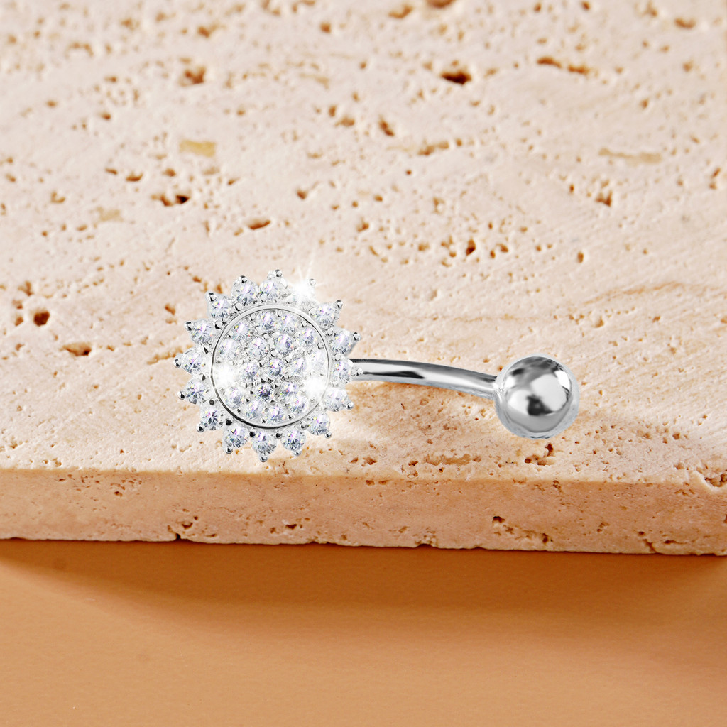 Piercing Umbigo Banana Prata 925 Flor e Sol Zircônias Cravejado | Piercing de Umbigo Pequeno Ponto De Luz