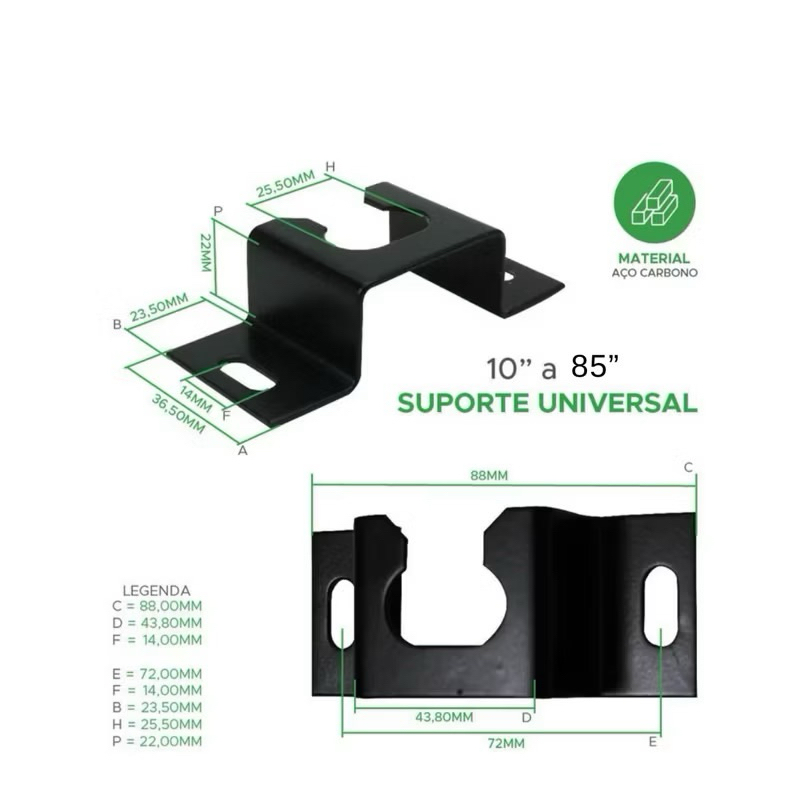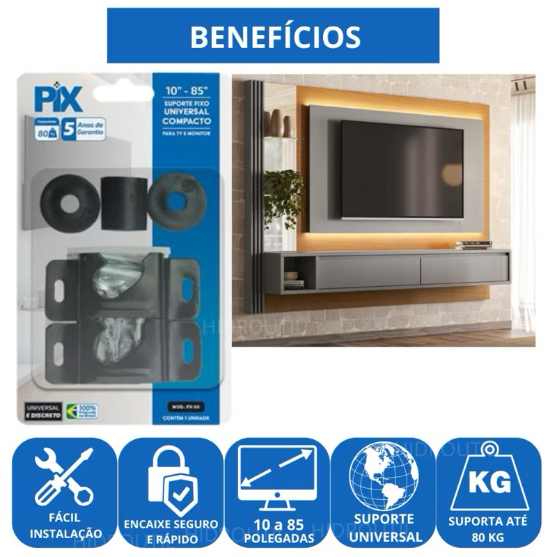 Suporte fixo Universal PIX p/ TV 10–85 polegadas até 80 Kg todas as marcas Parede/Painel Smart Led