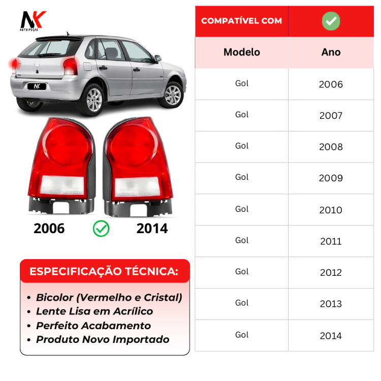 Lanterna Traseira Gol G4 2006 2007 2008 2009 2010 2011 2012 2013 2014 Cristal 1ªLinha Novo