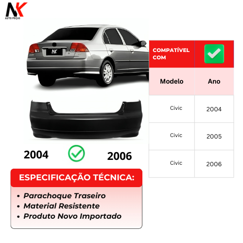 Parachoque Traseiro Civic 2004 2005 2006 Sedan 1ª Linha Novo