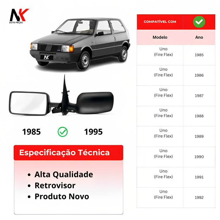 Par/Un Retrovisor Uno Fixo 1985 1986 1987 1988 1989 1990 1991 1992 1993 1994 1995 2P 4P