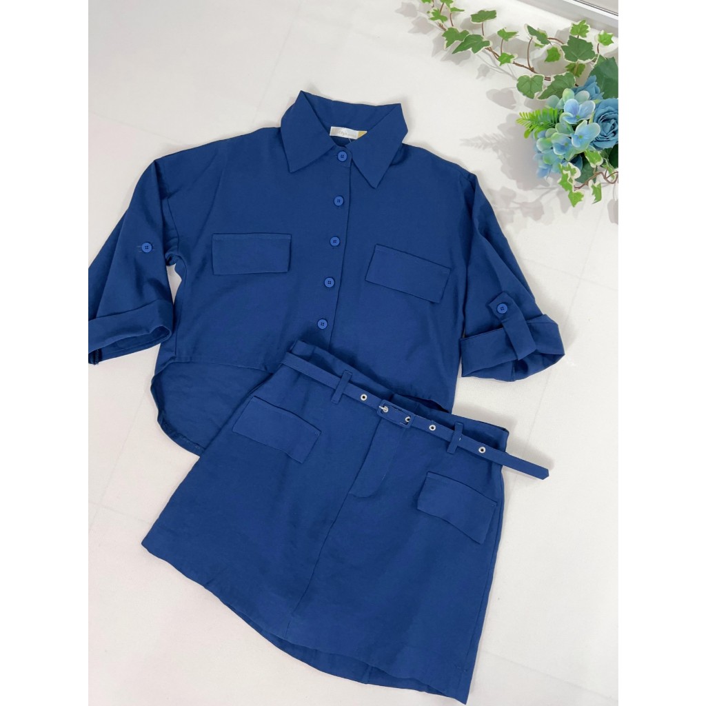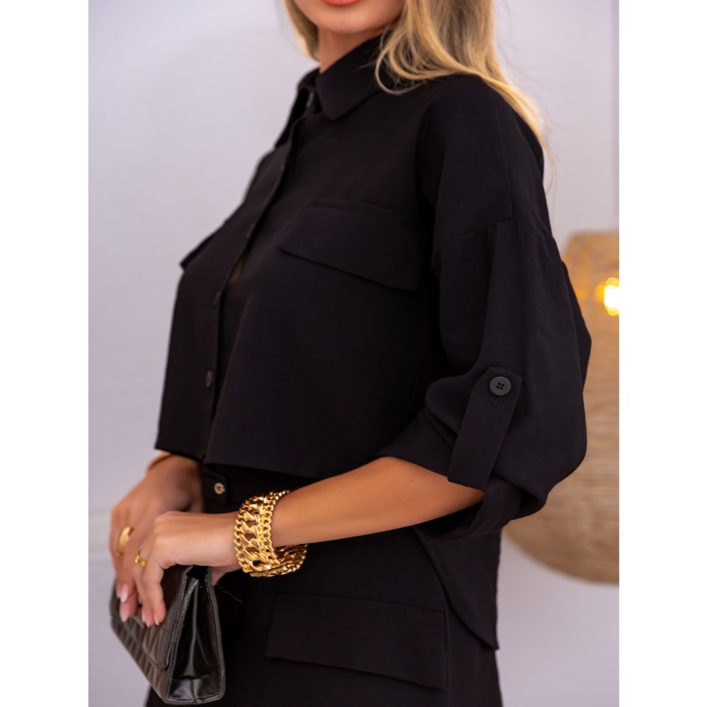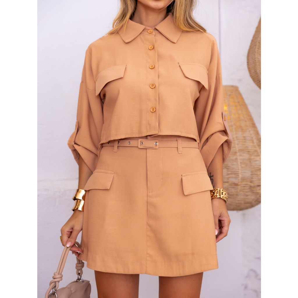 Conjunto Marrant Elegante | Camisa com Manga Três quarto e Short Saia Sofisticado | Com Cinto
