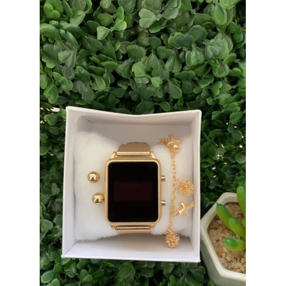 Relógio feminino - Kit: relógio,brinco, pulseira e caixa.