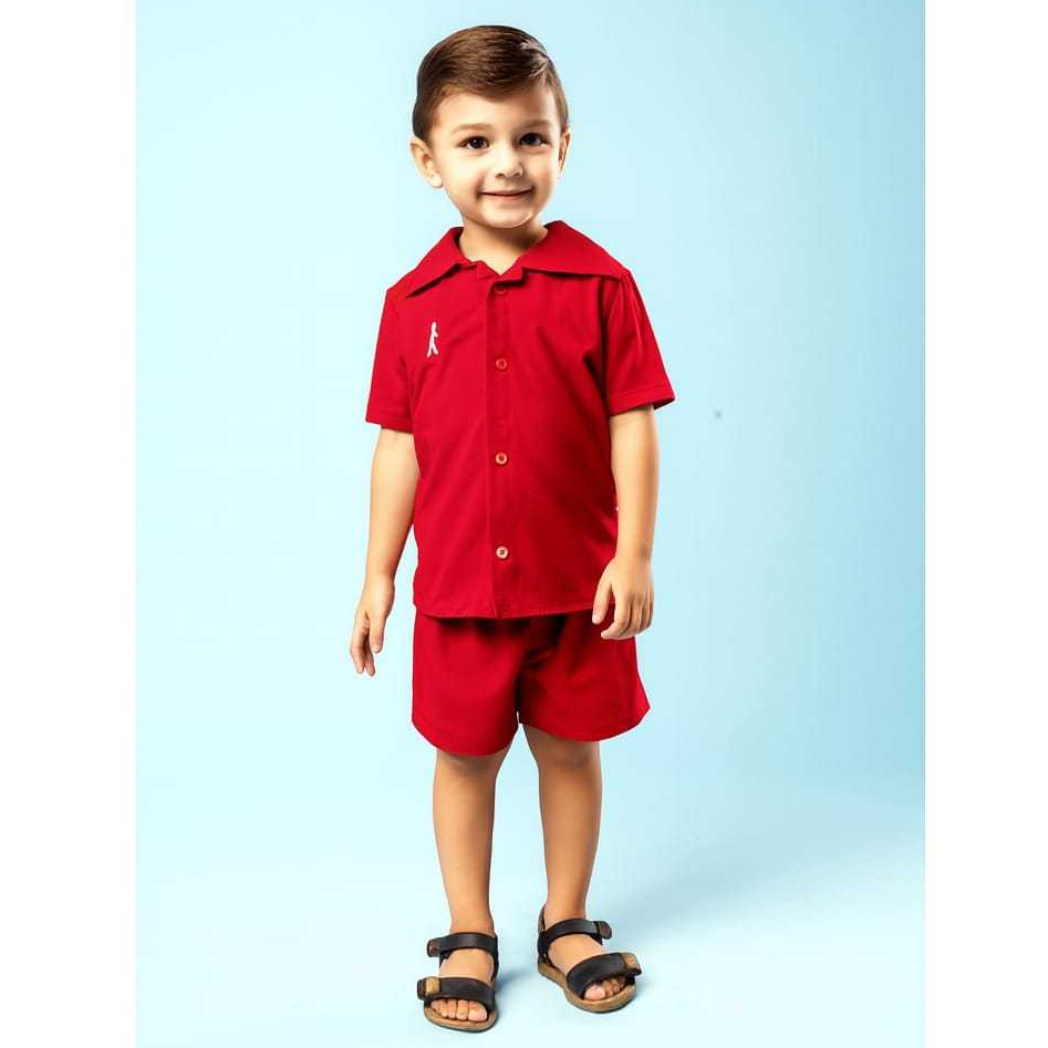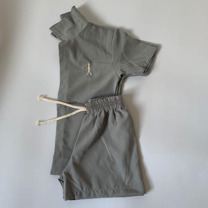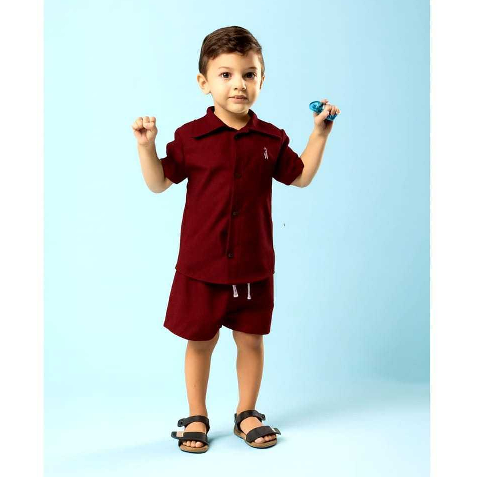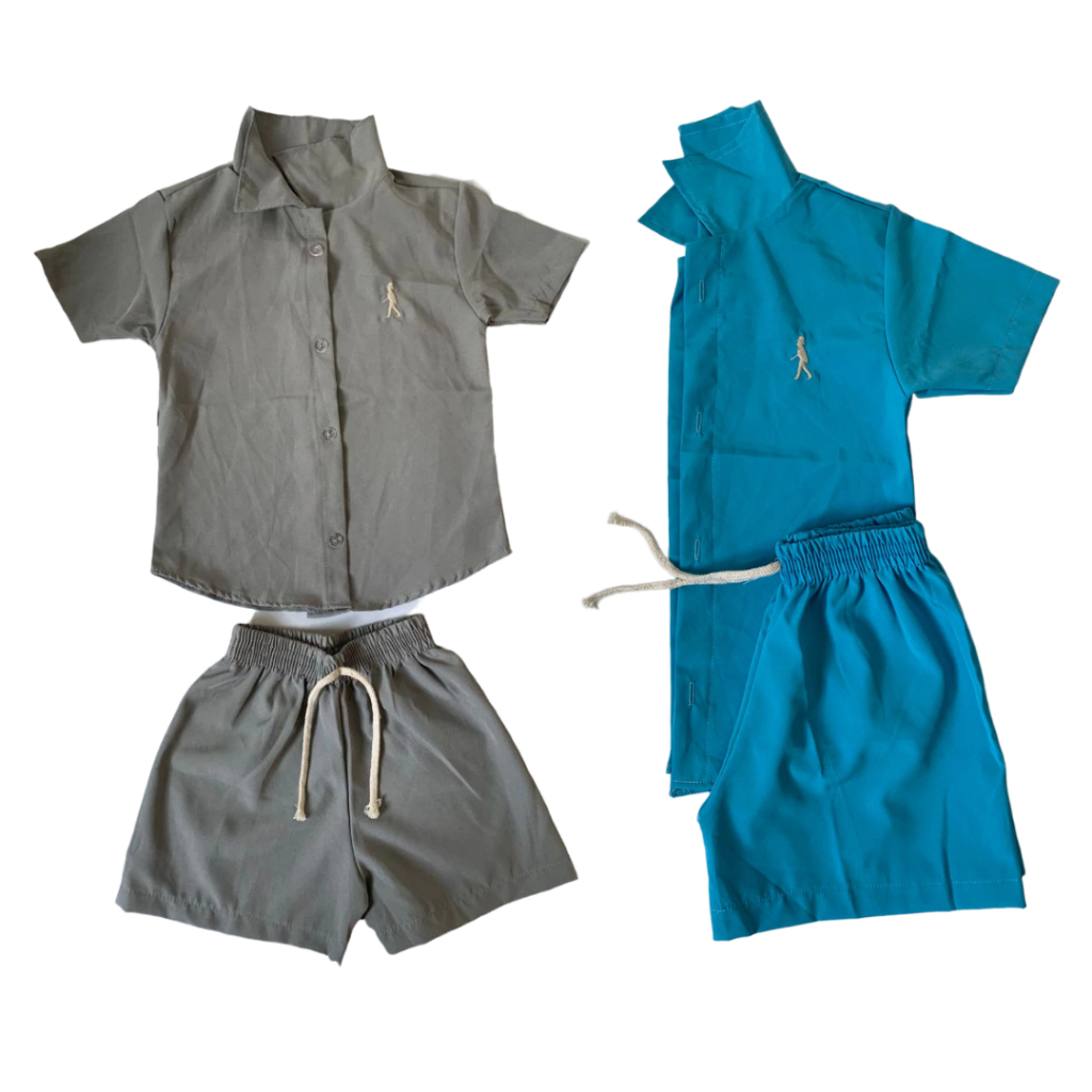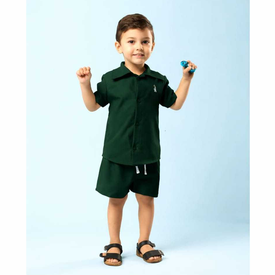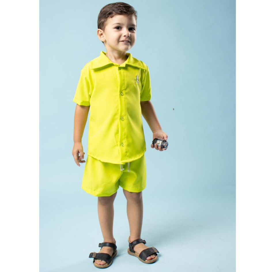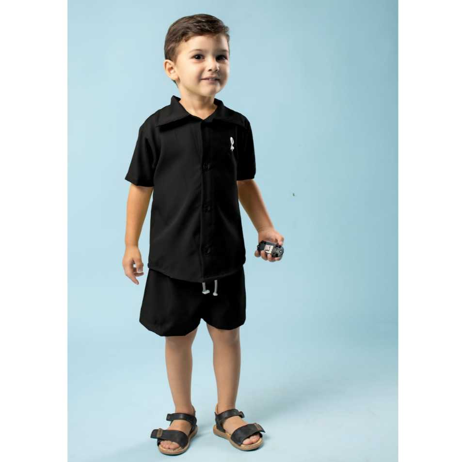 Conjunto Infantil Masculino 2 Peças Roupas de Criança Camisa de Botão e Short Bermuda Tecido Crepinho Menino