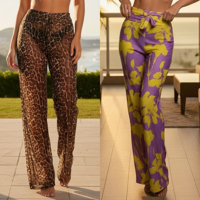 Calça Saída de Praia Feminina em Tule Estampada Leve Elegante Moda Verão Onça animal print floral