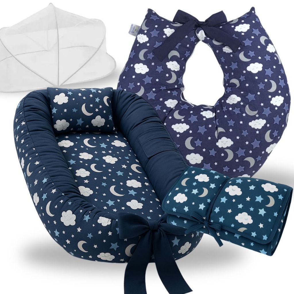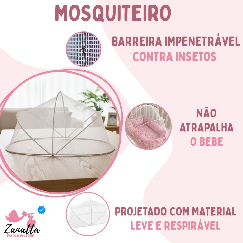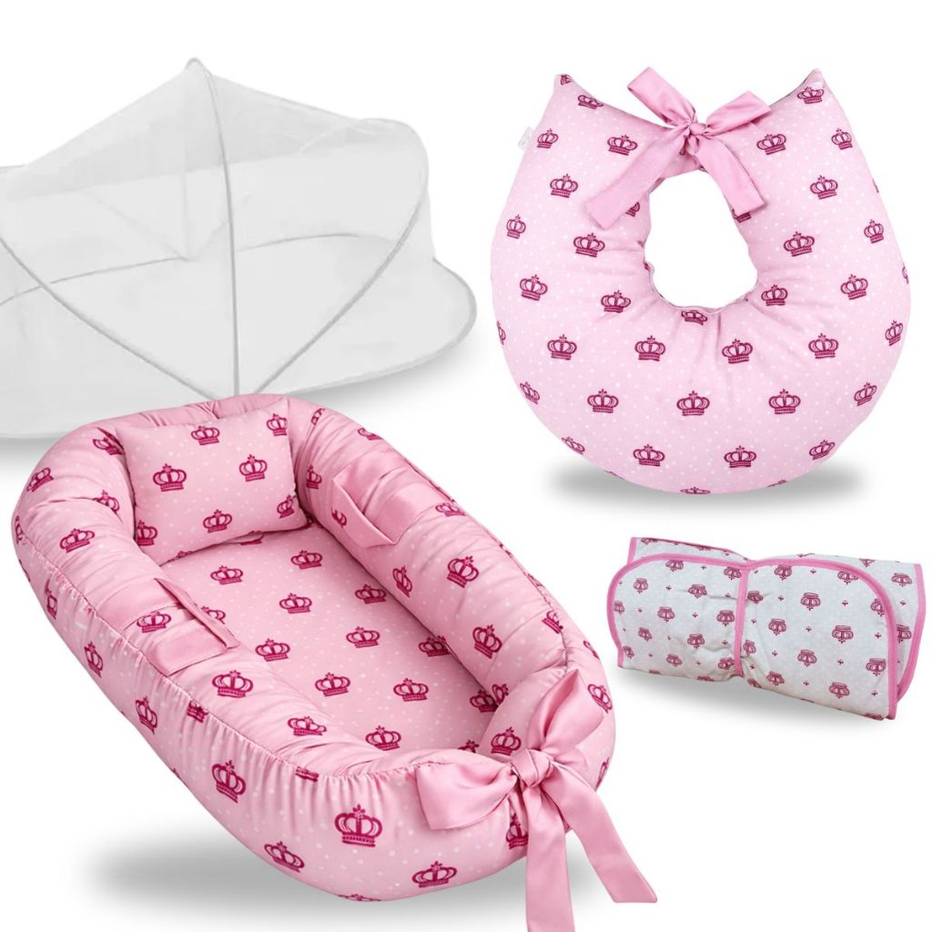 Ninho Redutor de Berço Almofada Para Amamentação Trocador Mosquiteiro Kit 4 Peças Enxoval Bebe Rosa
