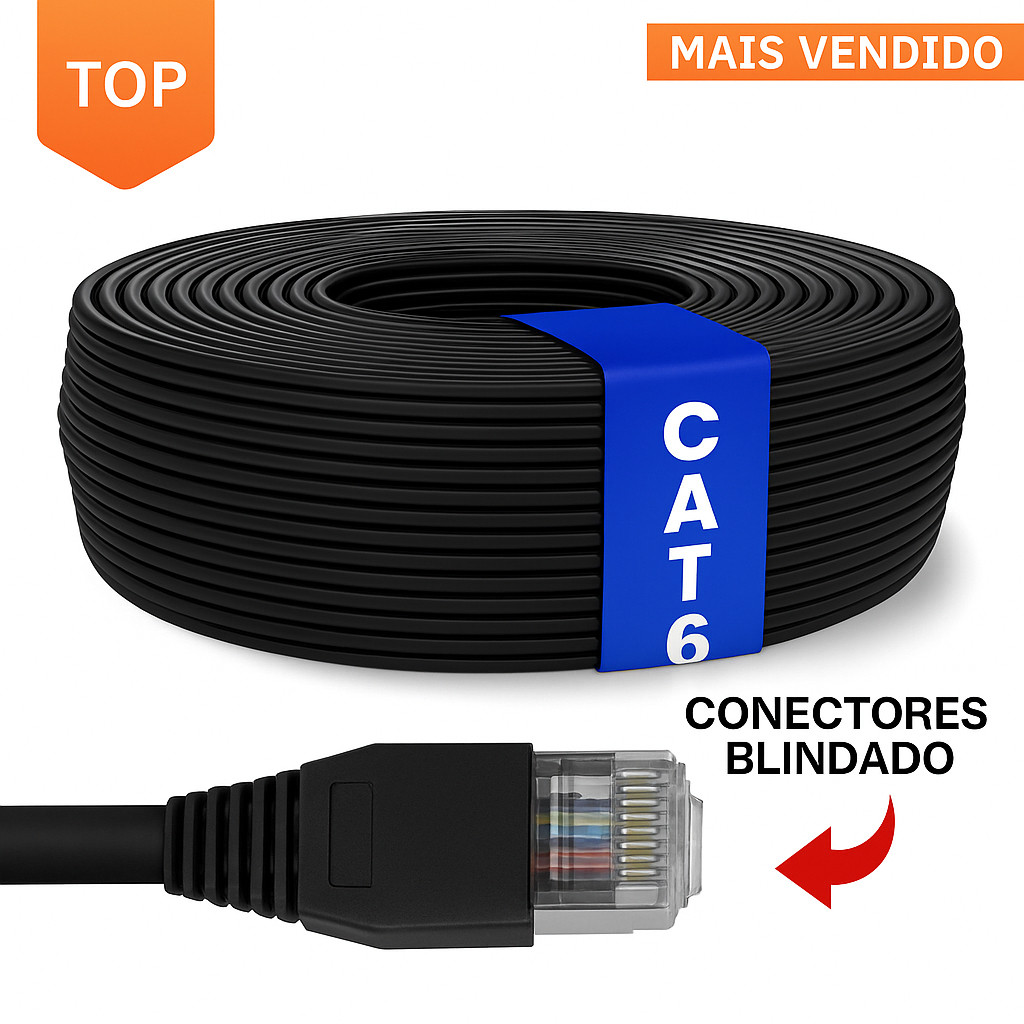 Cabo de Rede Cat6 PRETO C/ CONECTOR BLINDADO Alta Velocidade Internet - 5M a 30M (Interno/Externo)