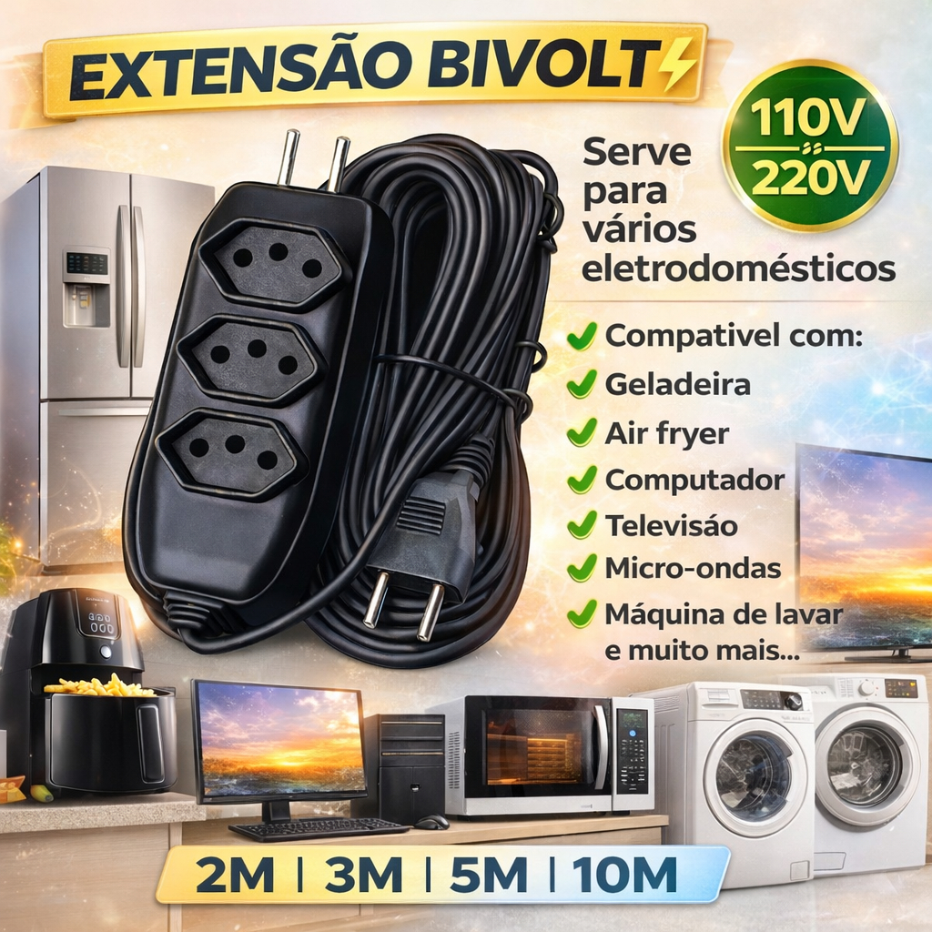Extensão de Energia 10A Bivolt 110/220V 2m 3m 5m 10m Tripolar Preta Durável