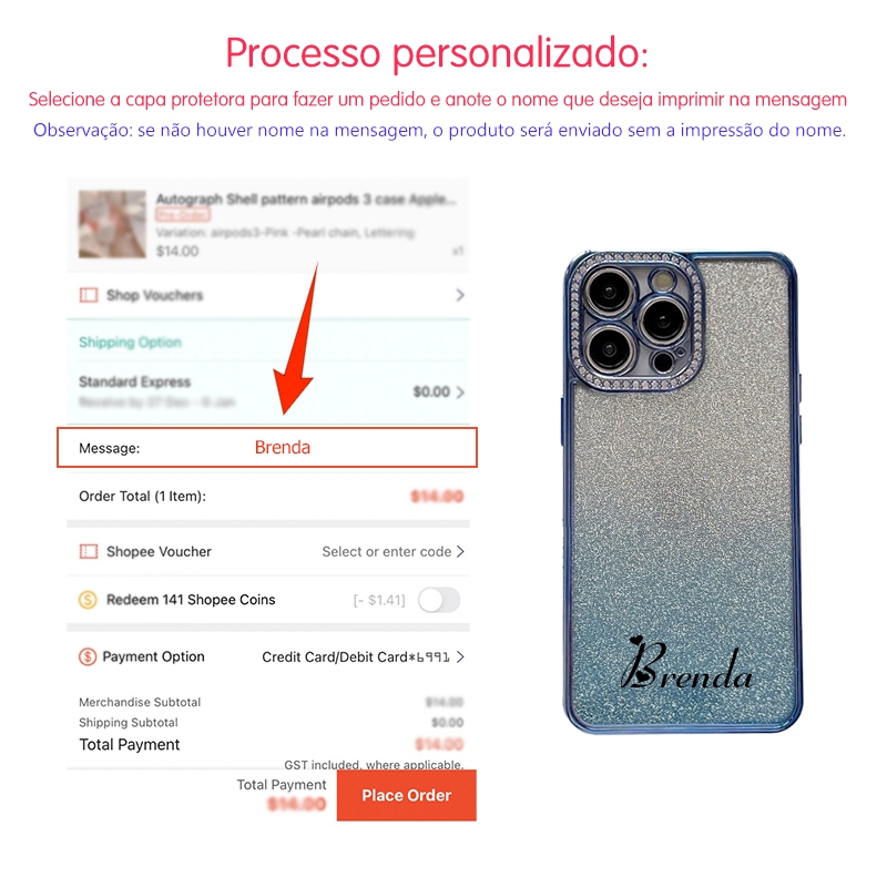 Novo Luxo glitter Diamante Nome Personalizado Caso De Telefone Para iphone 17 pro max 15 16 13 12 promax Embalagem