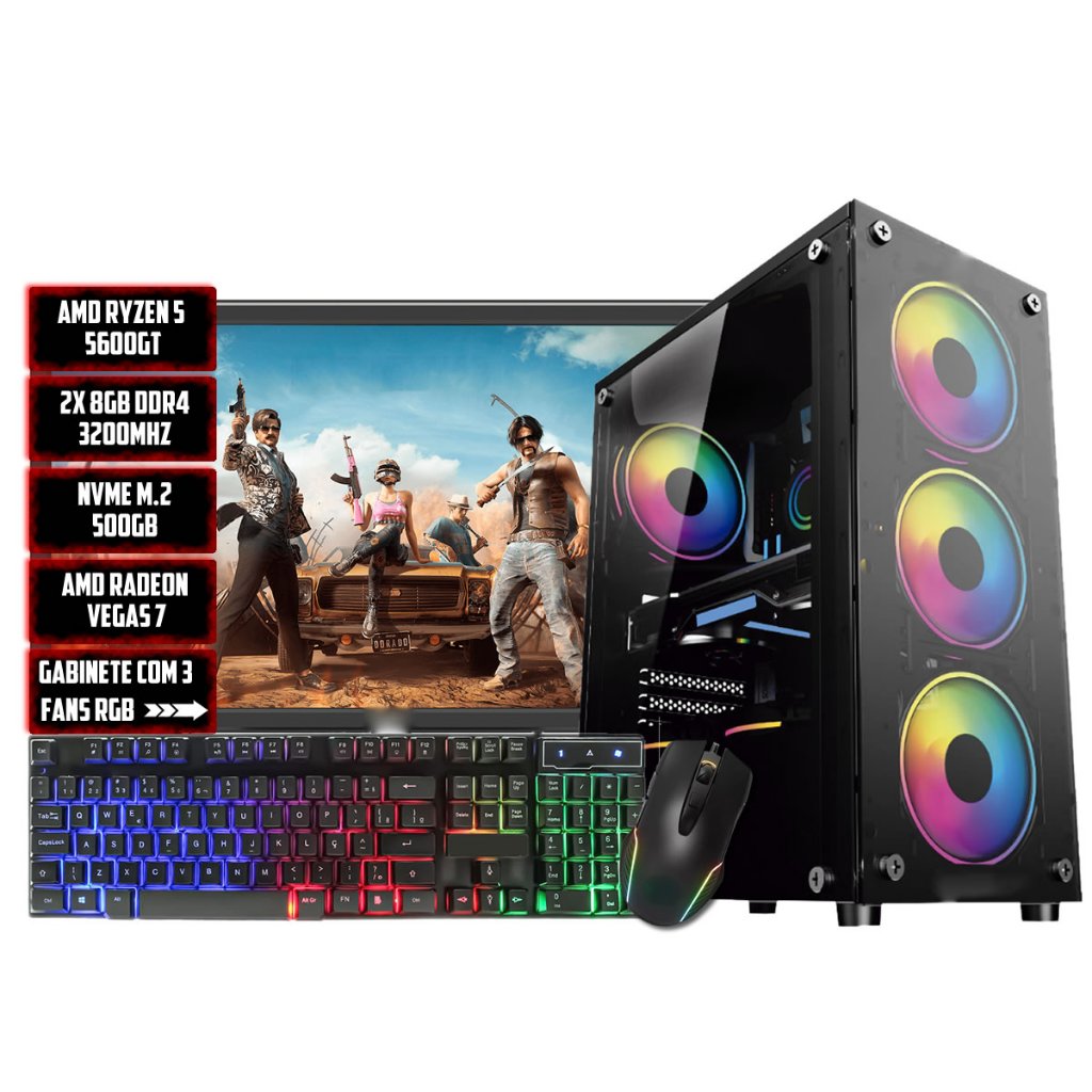 PC GAMER COMPLETO AMD RYZEN 5 5600GT, 16GB RAM, 1TB, MONITOR 21,5", TECLADO, MOUSE E HEADSET, WI-FI