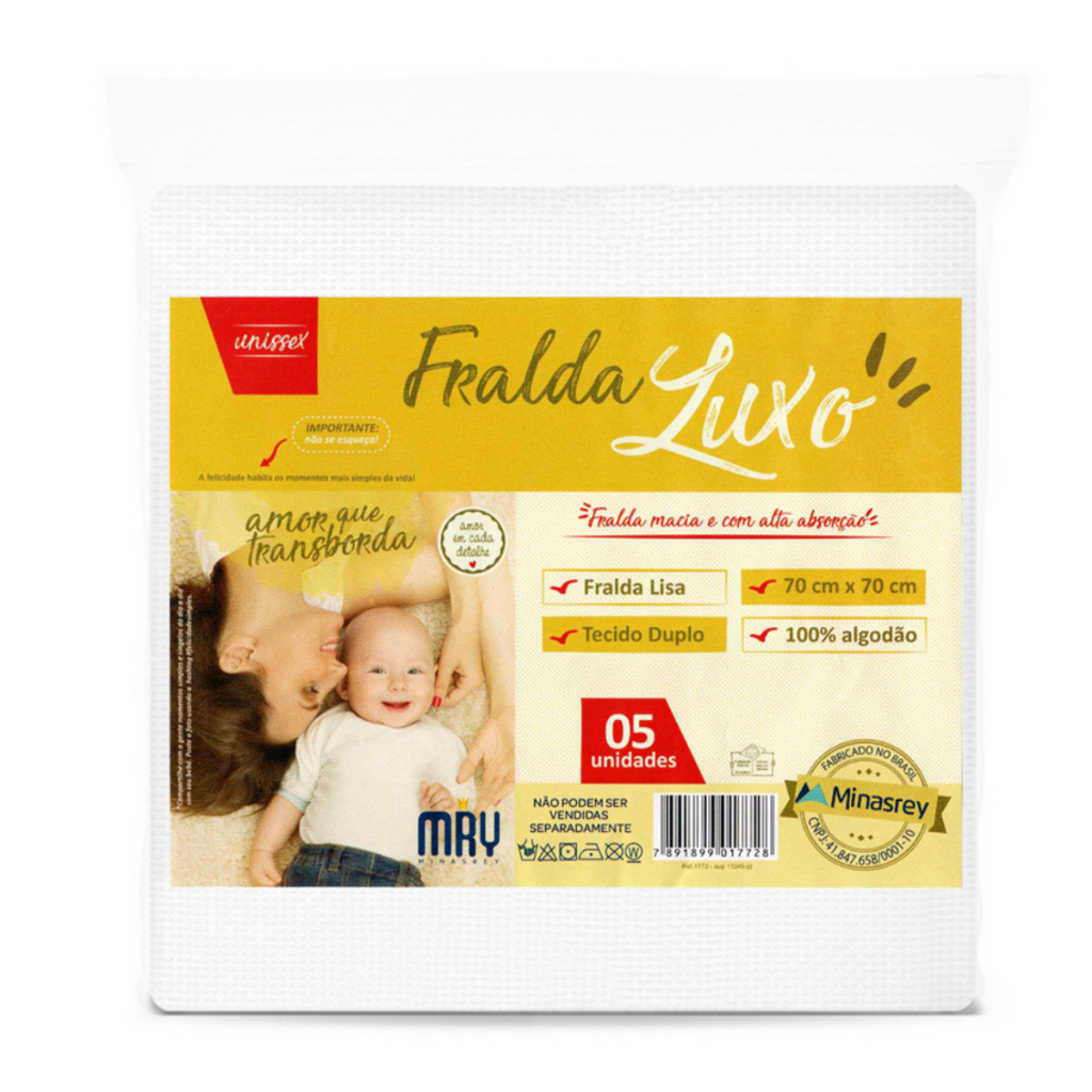 Pacote com 5 Fraldas de Pano Luxo Lisa Branca Marca Minasrey p/ Bebês e Recém-Nascidos 70cm x 70cm - 100% Algodão Tecido
