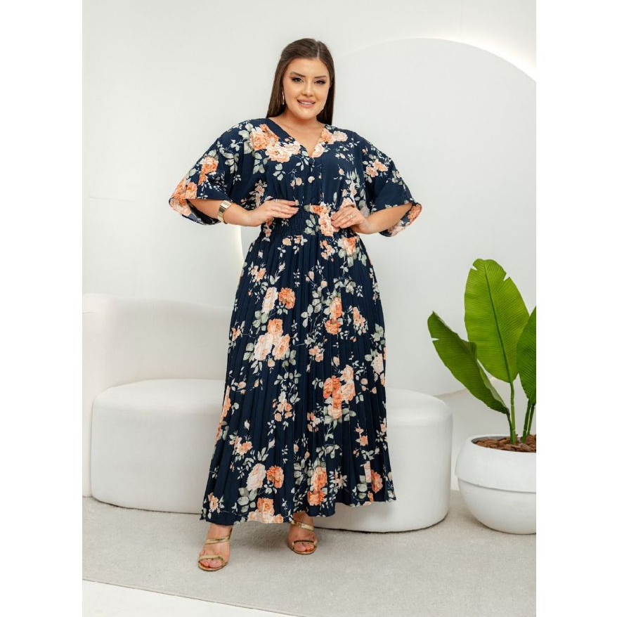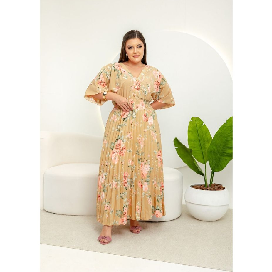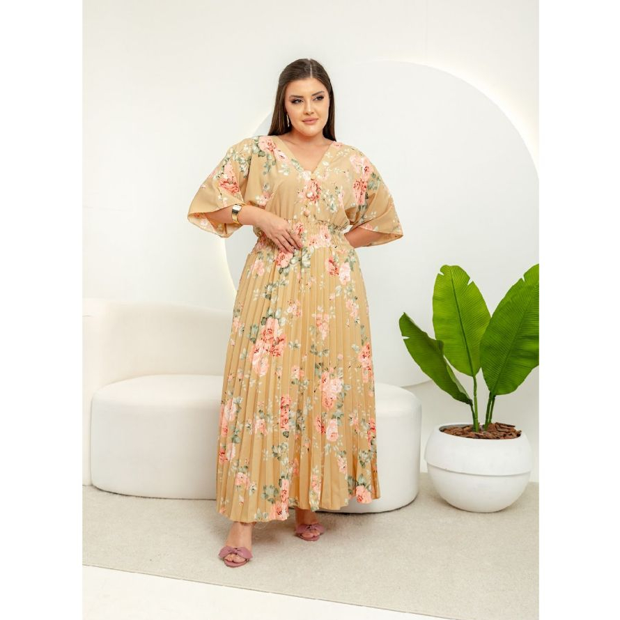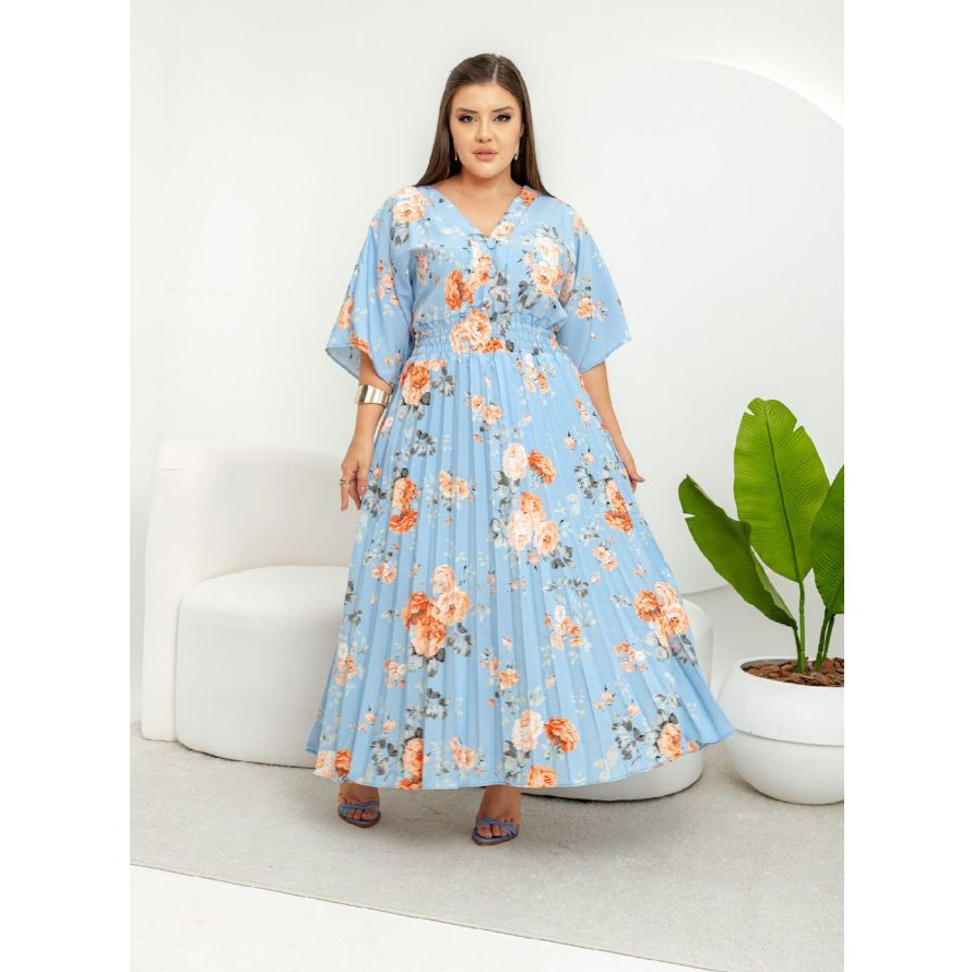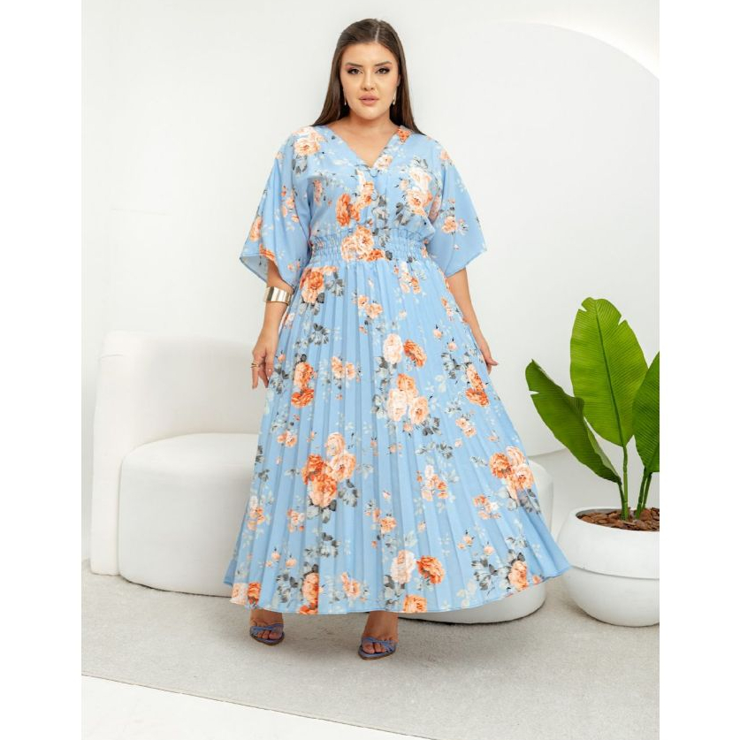 Vestido Longuete Plissado Floral Com Elático na Cintura Moda Evangélica 172