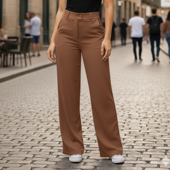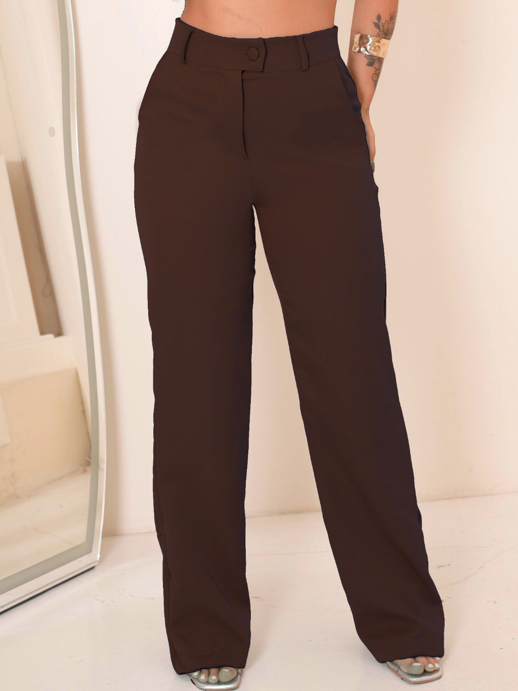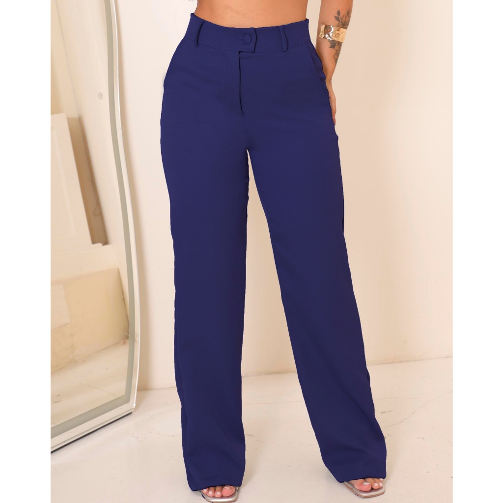 Calça Social Reta Feminina Cintura Alta Alfaiataria com Zíper, Botão e Bolsos Funcionais