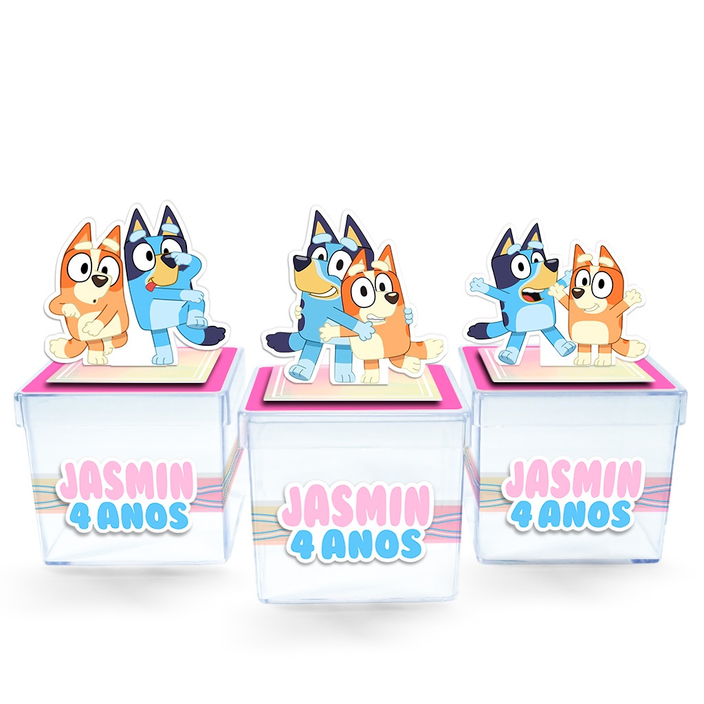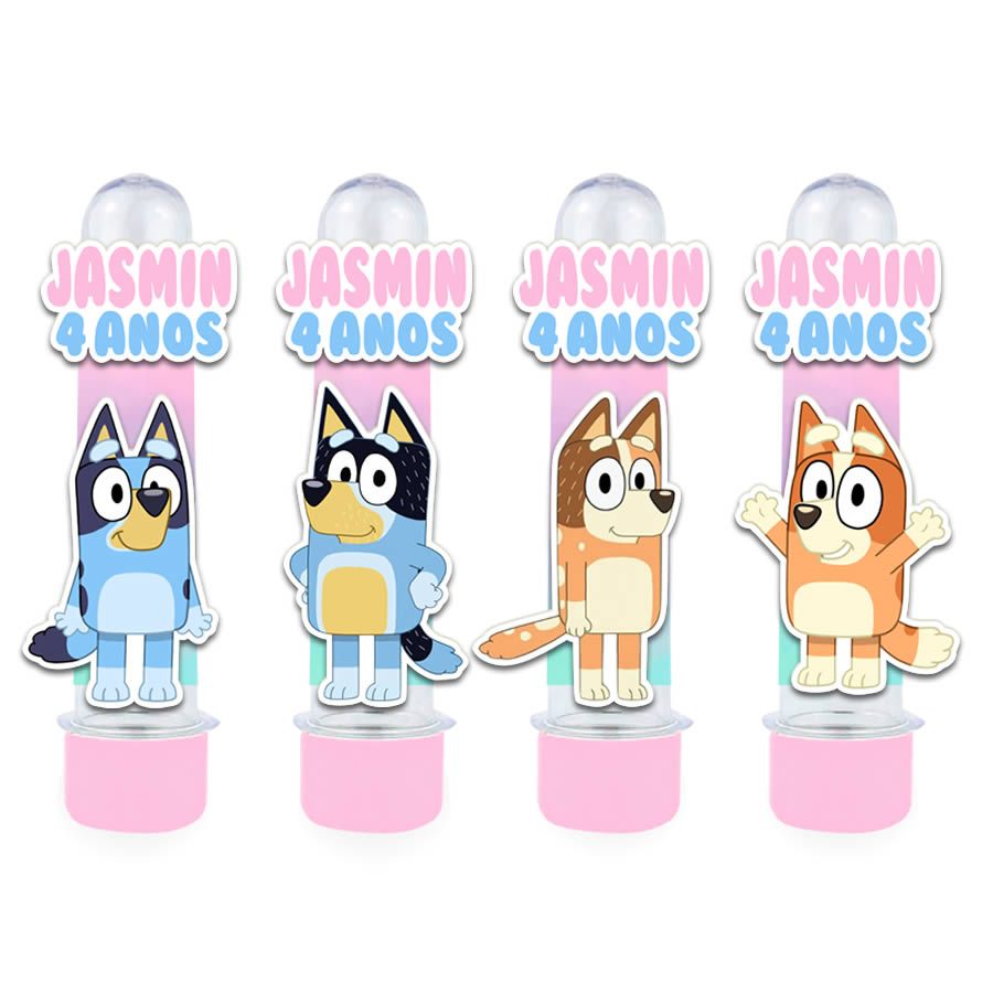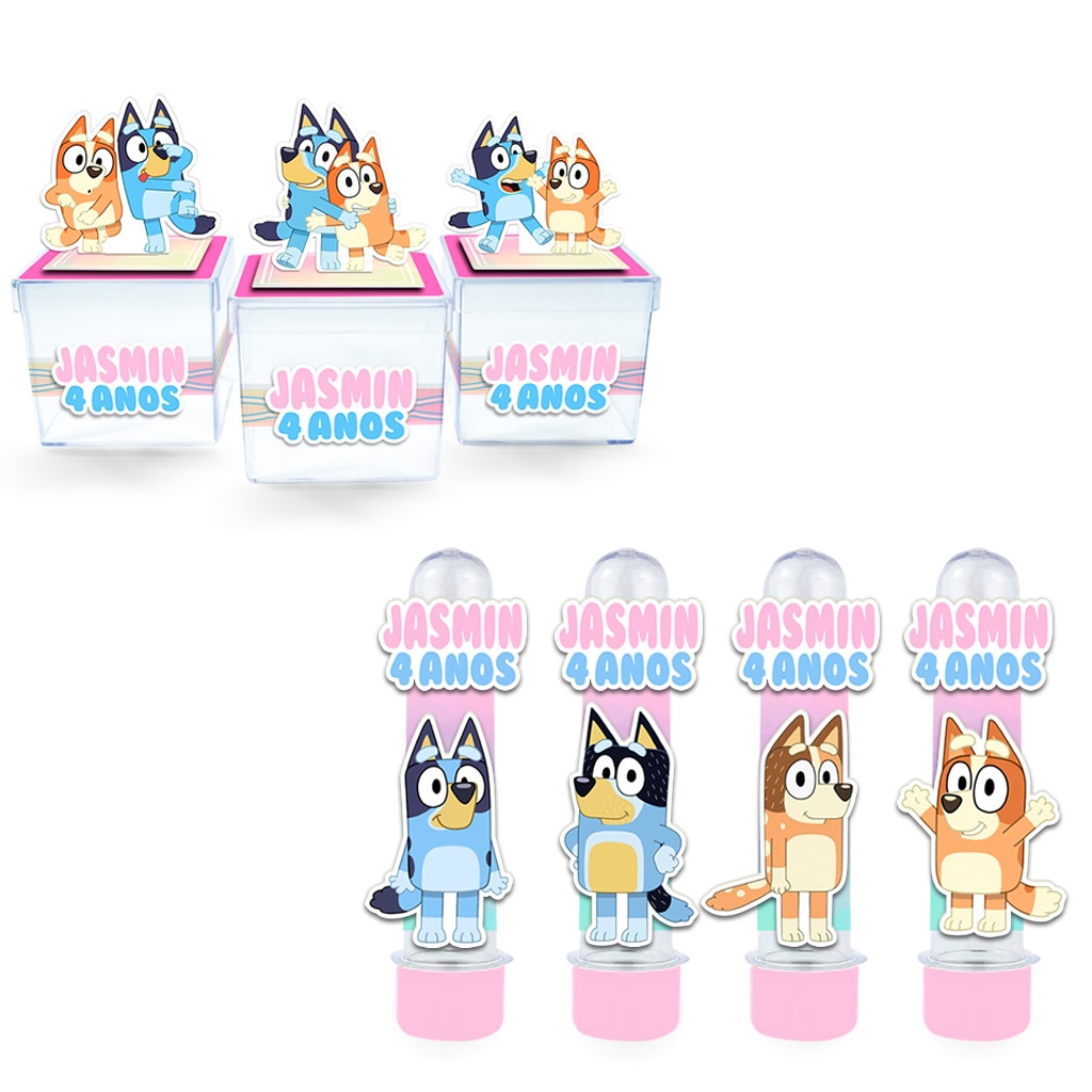 Kit de tubetes e caixa acrílica Bluey para lembrancinha de festa