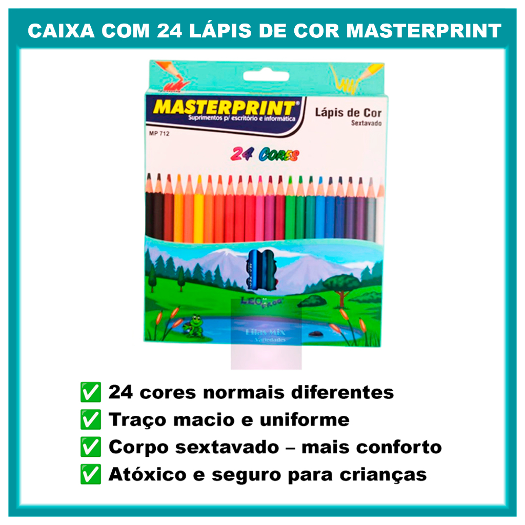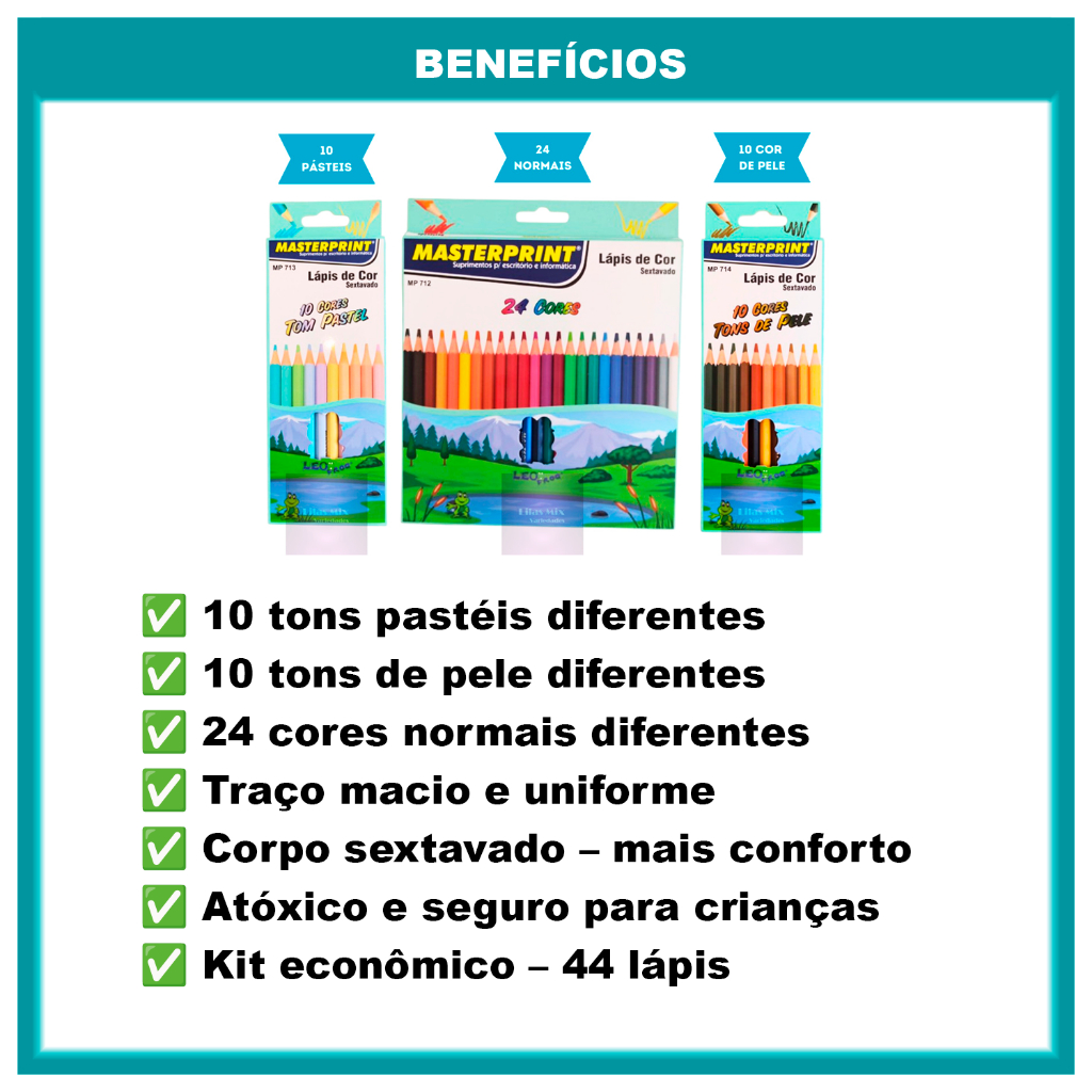 Kit 44 Lápis de Cor Escolar Sextavado Masterprint (24 CORES + 10 cores Tom Pastel +10 Tons de Pele)