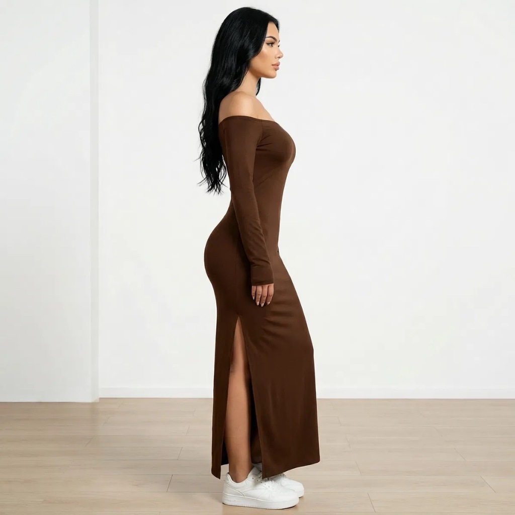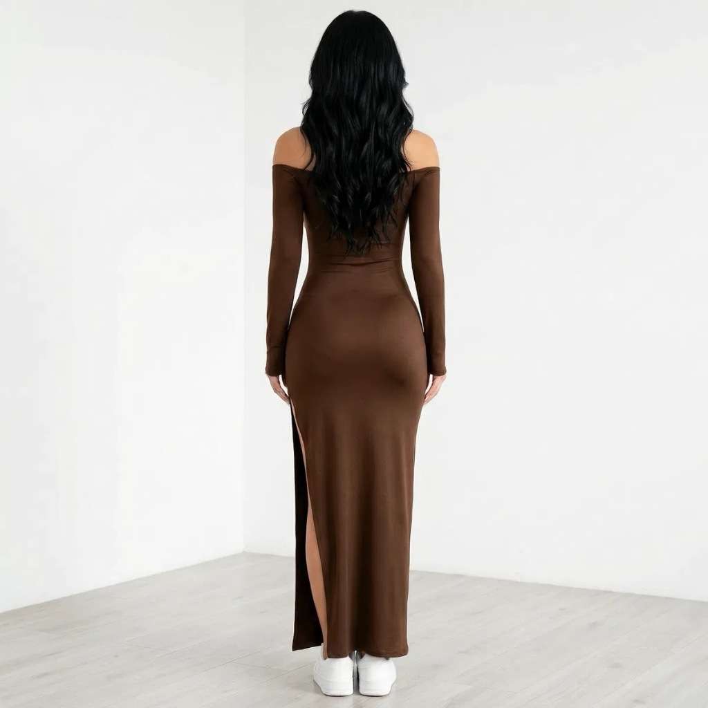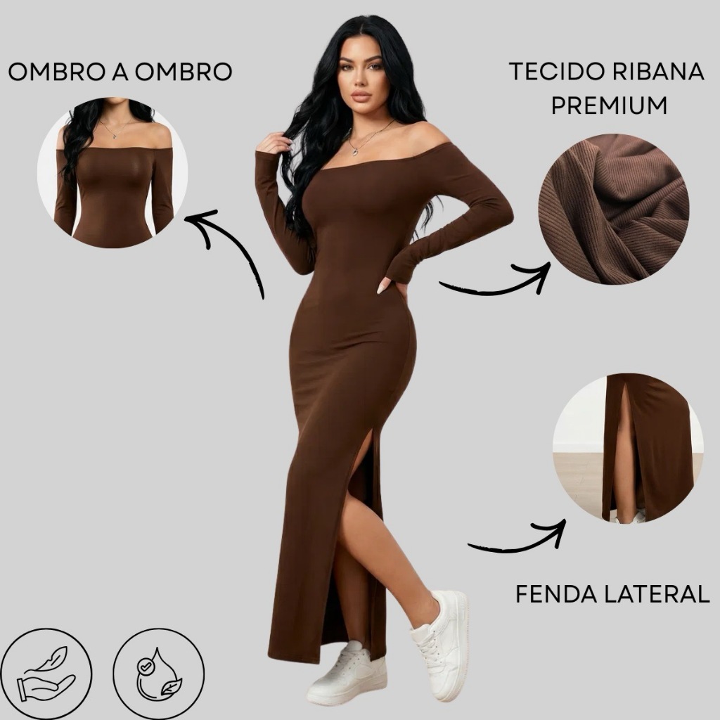 Vestido Feminino Ombro A Ombro Manga Longa Com Fenda Lateral Inverno Festa Ribana Canelada