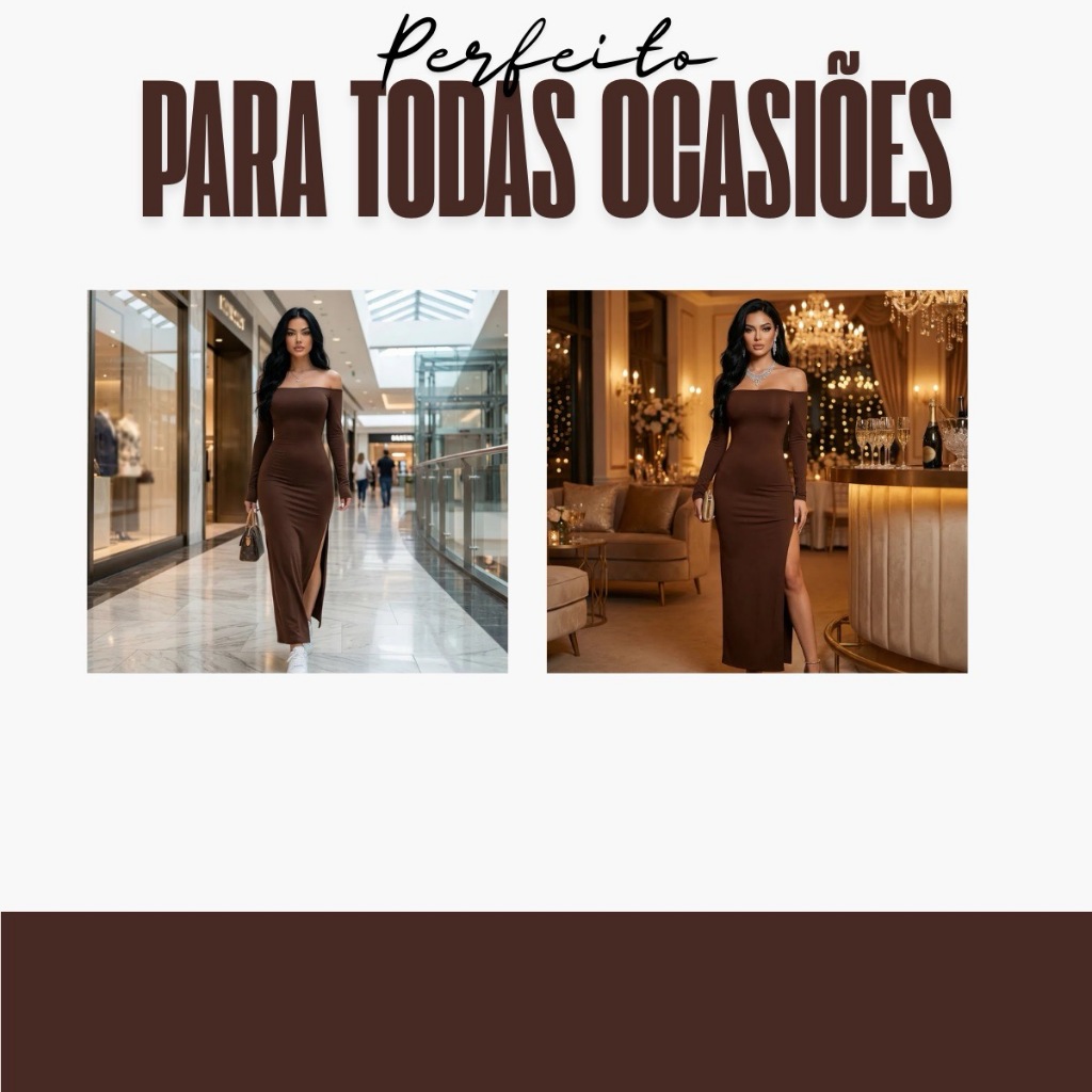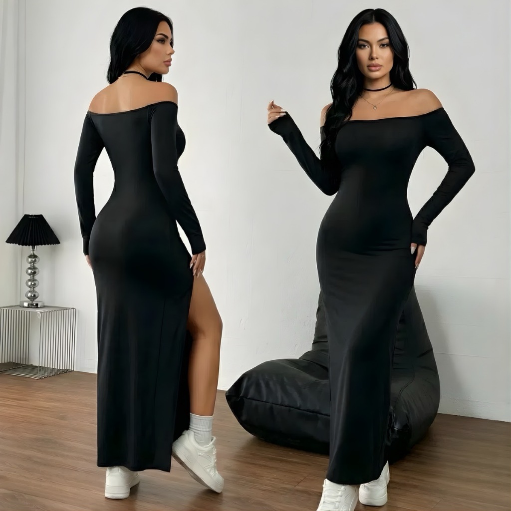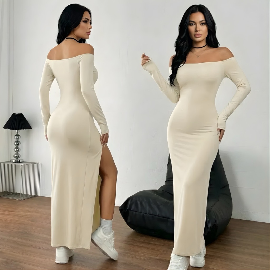 Vestido Feminino Ombro A Ombro Manga Longa Com Fenda Lateral Inverno Festa Ribana Canelada