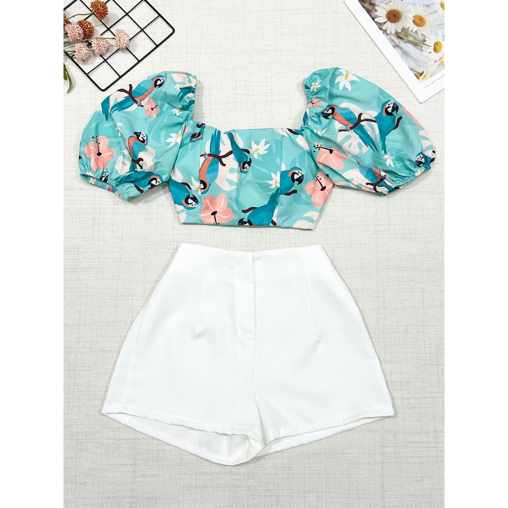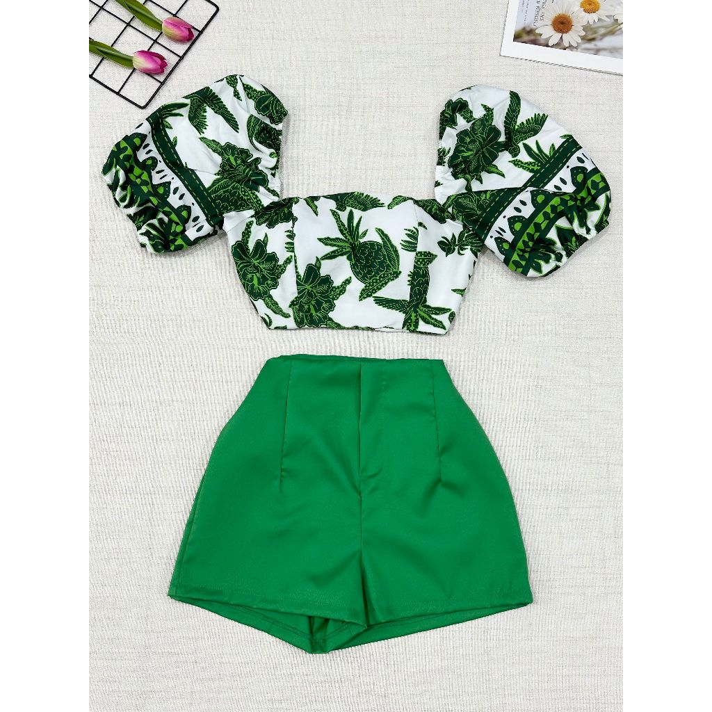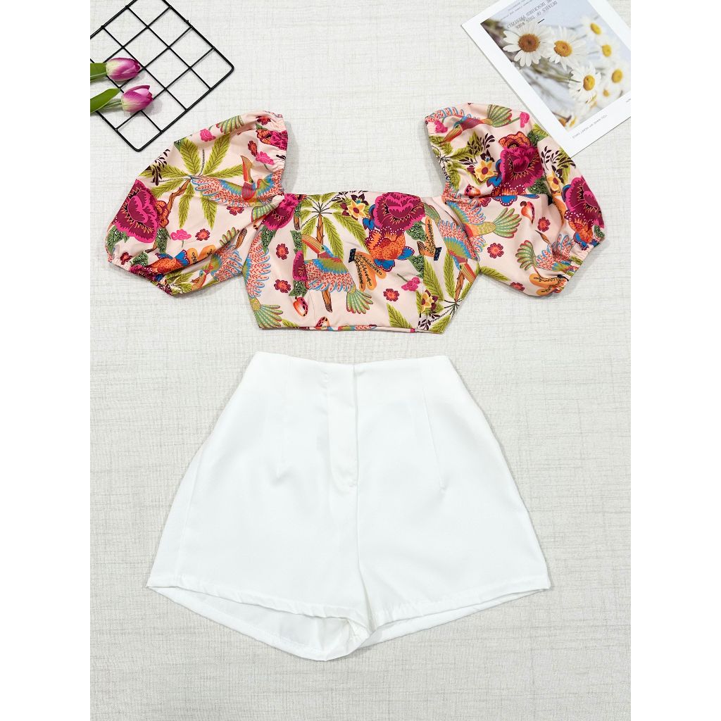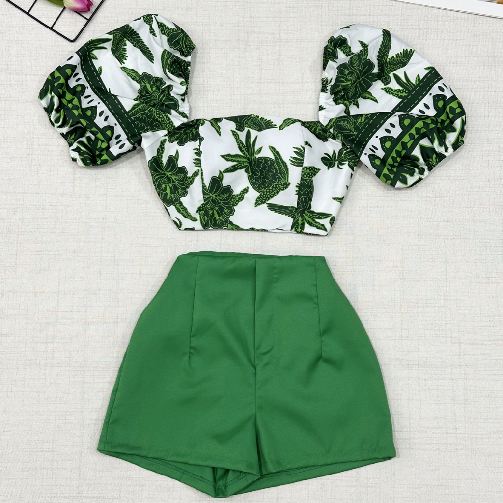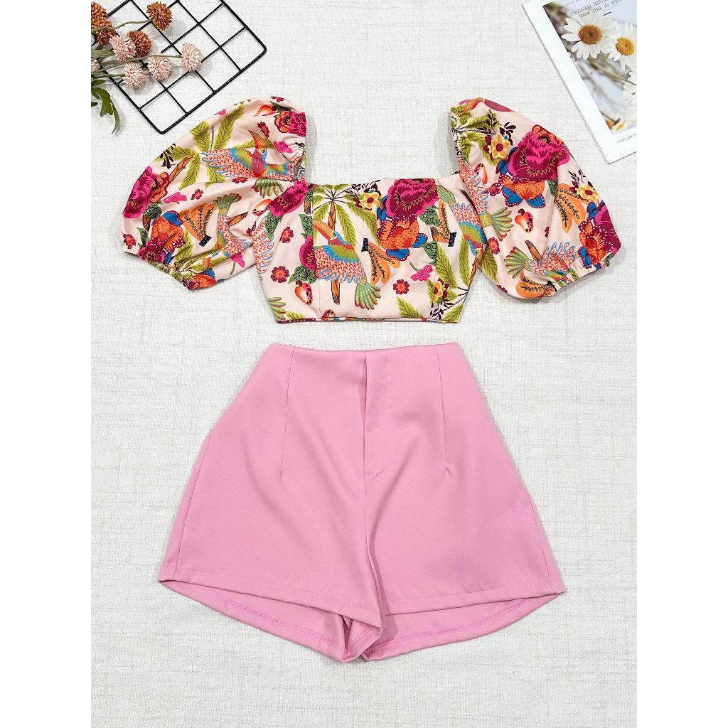 2025Conjunto camisa tamanho unico da pra amarra atras com elastano e com estampa , short com ziper sem bolso