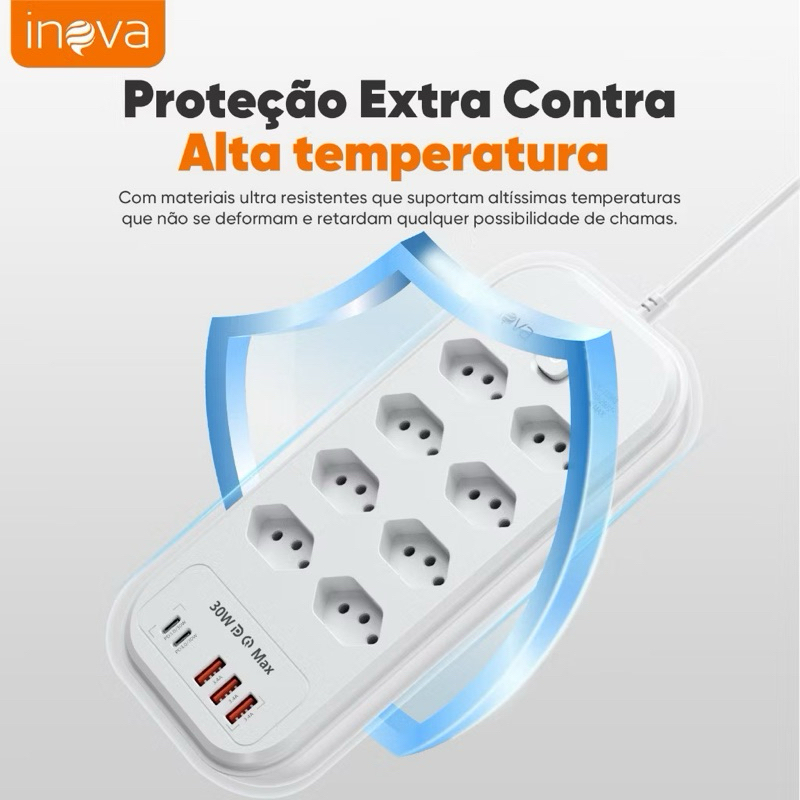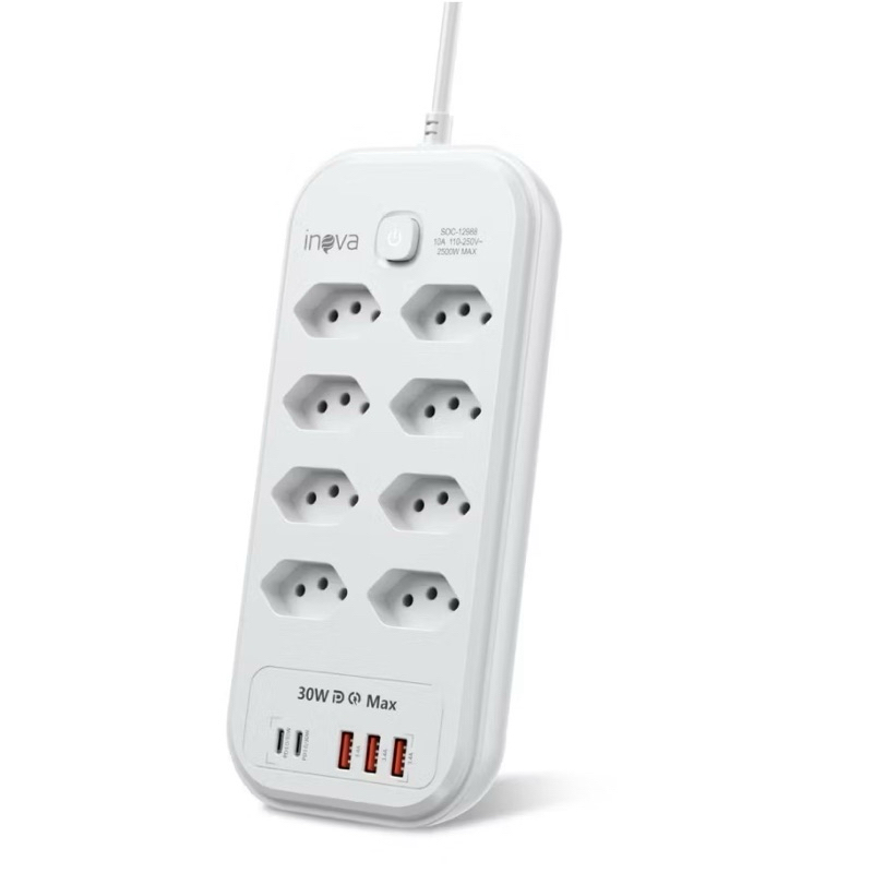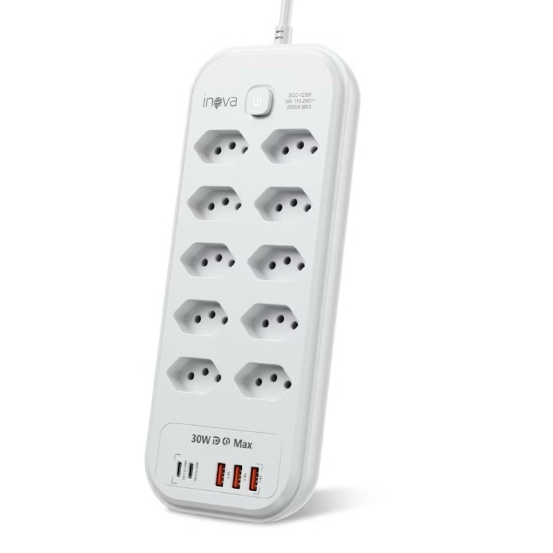 Régua Filtro Inova 10 Tomadas + 5 USB QC PD 30W Carregamento Rápido Type-C 22W Proteção - Extensão