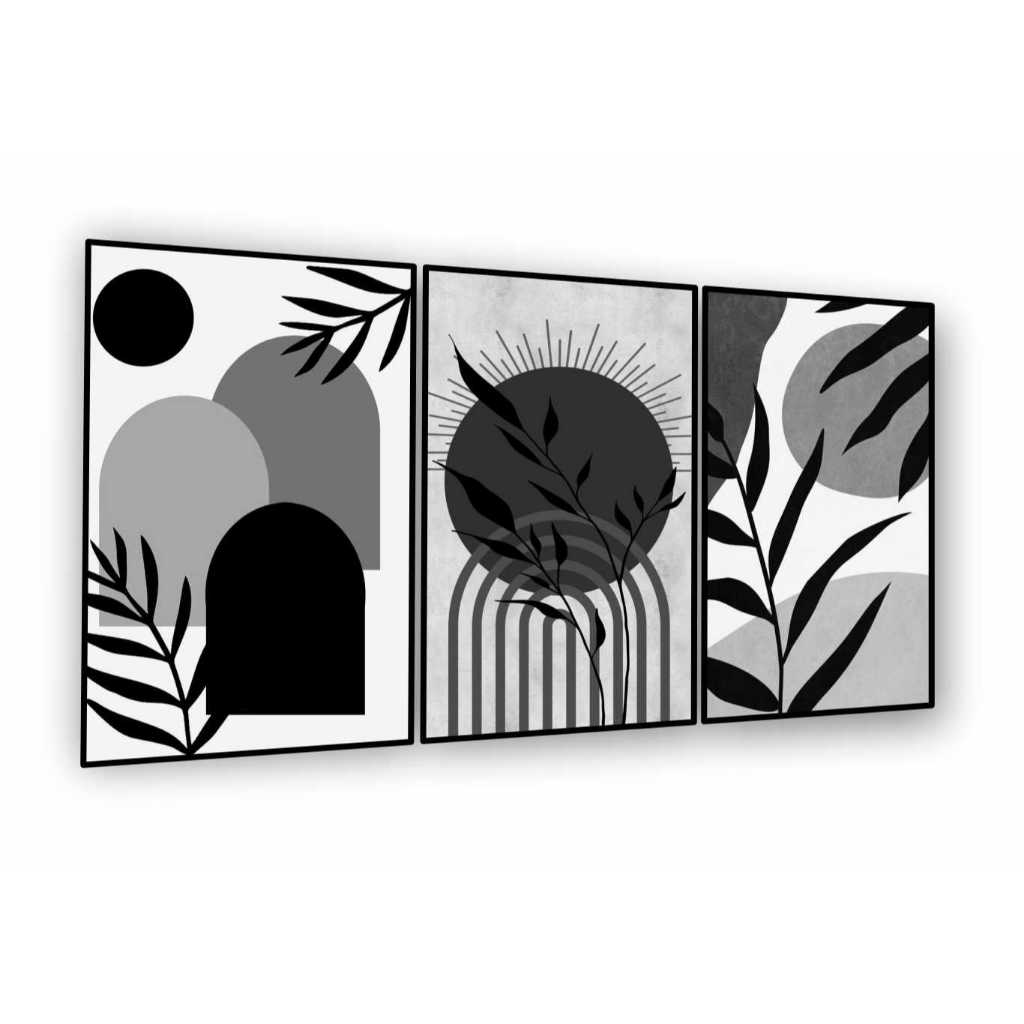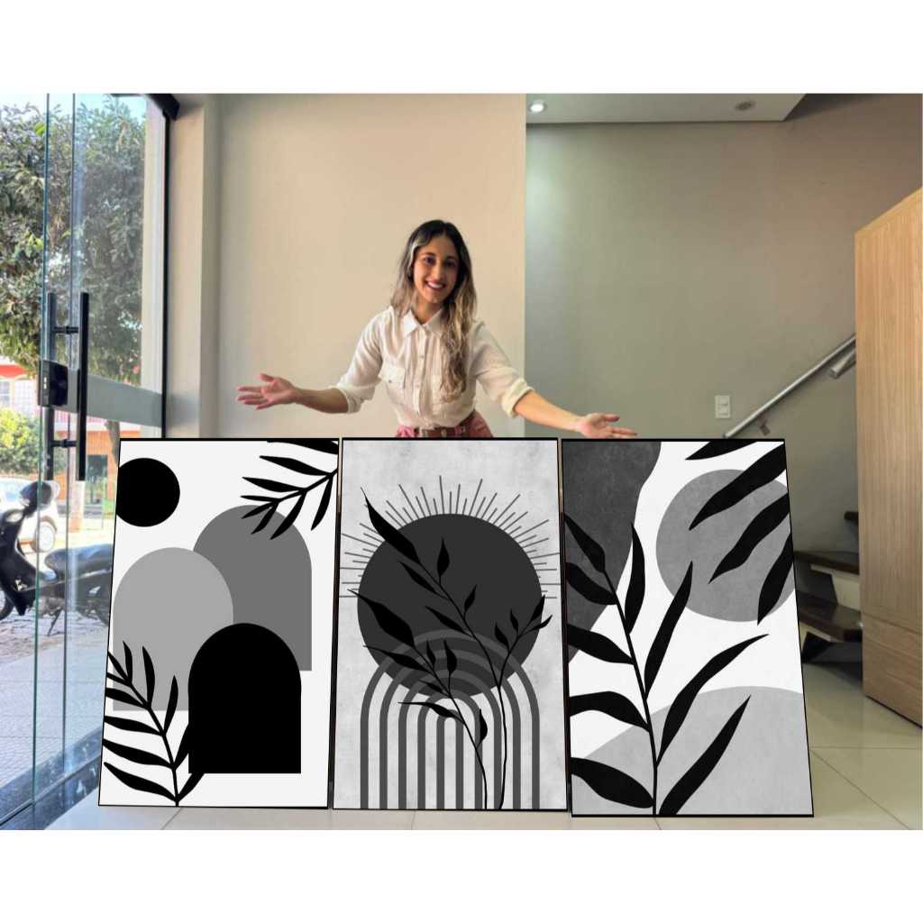 Quadros Decorativos 3 Peças Arte Abstrata Círculos Listras Cinza