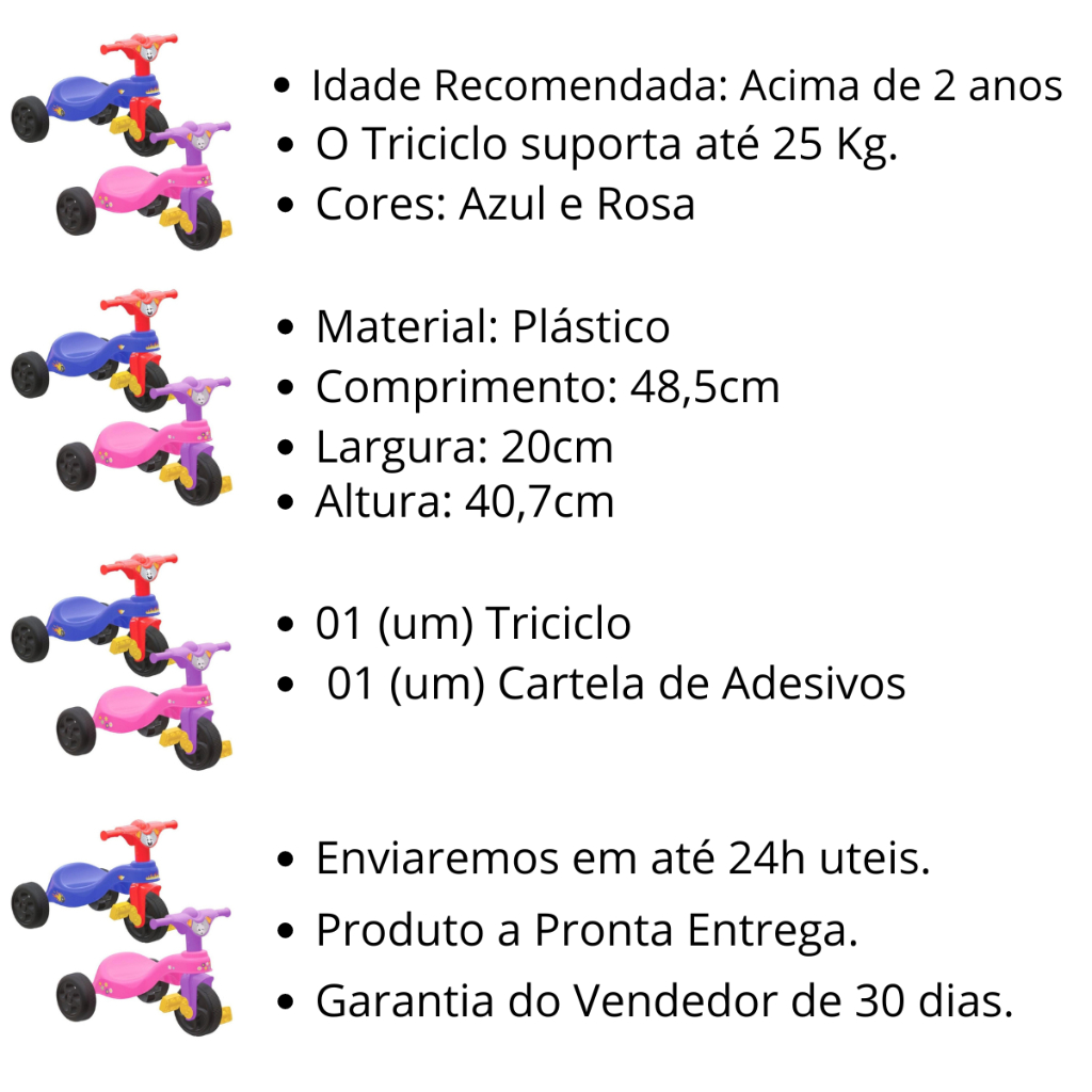 Triciclo Infantil Motoca Pais e Filhos Velotrol Carrinho de Passeio menino e menina