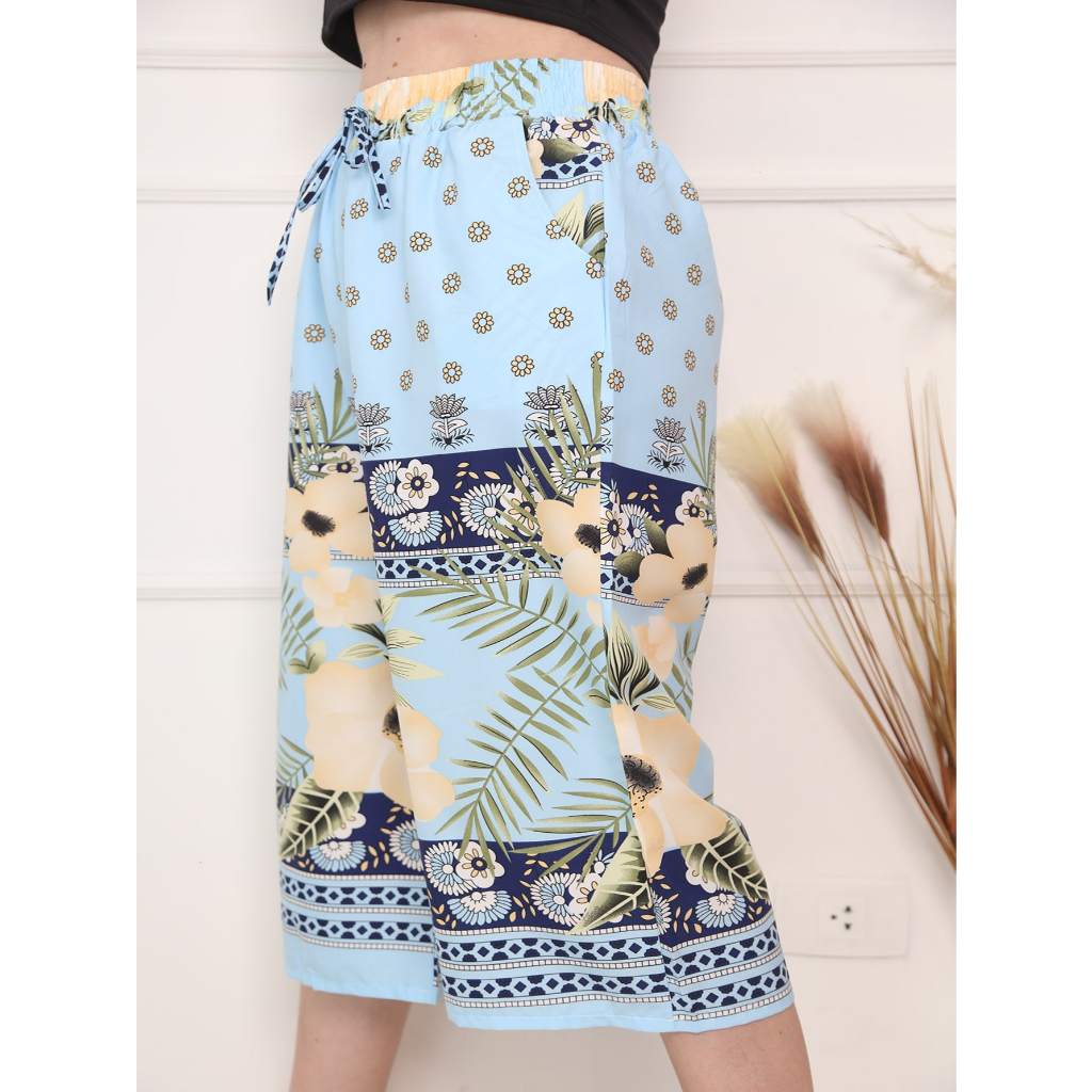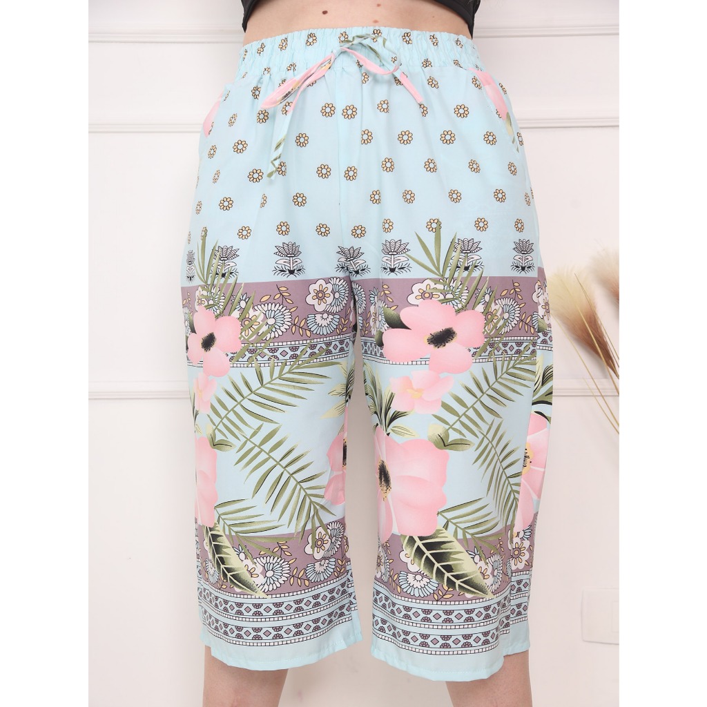 Calça pantacurt floral feminina tecido em poliester com elastano elástico na cintura detalhe cordão amarração