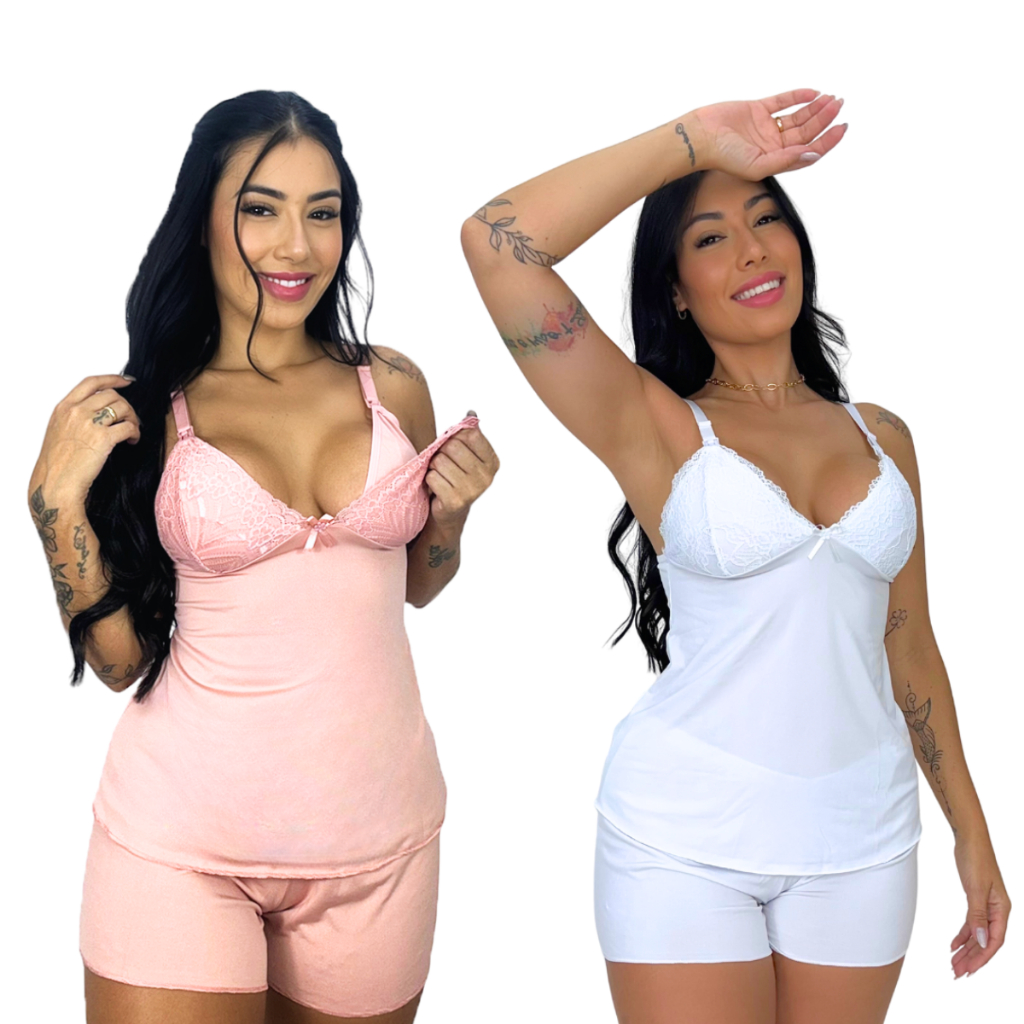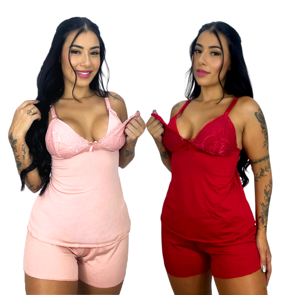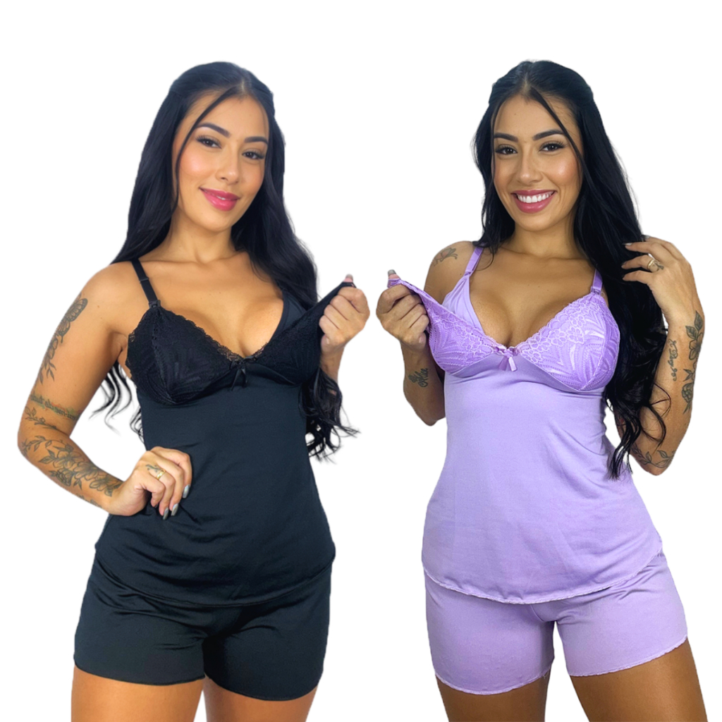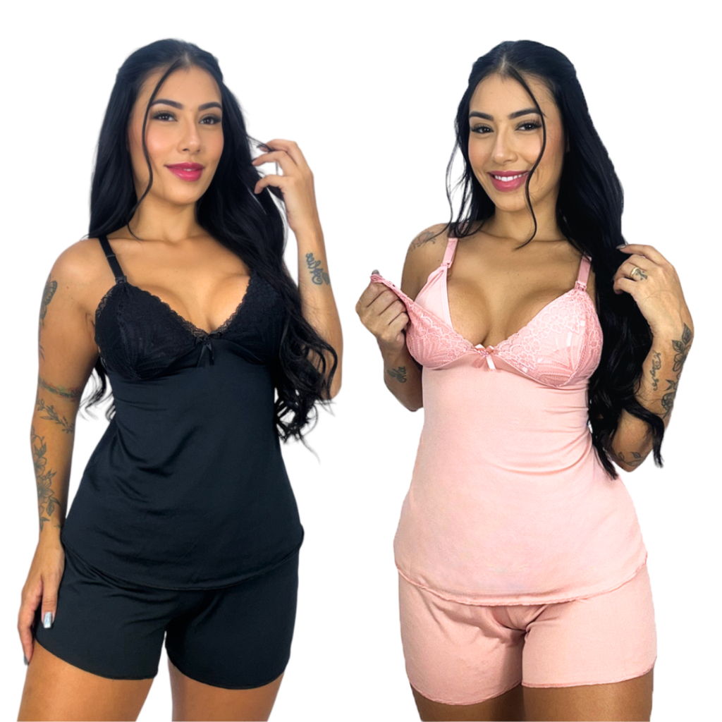 Kit 2 Baby Doll Amamentação para Maternidade Short Doll Gestante Pós Parto Abre Fácil