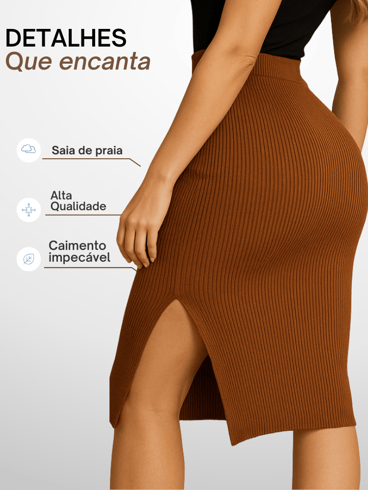 Saia Tricot Feminino Canelada Midi Fenda Lateral Elegante Casual