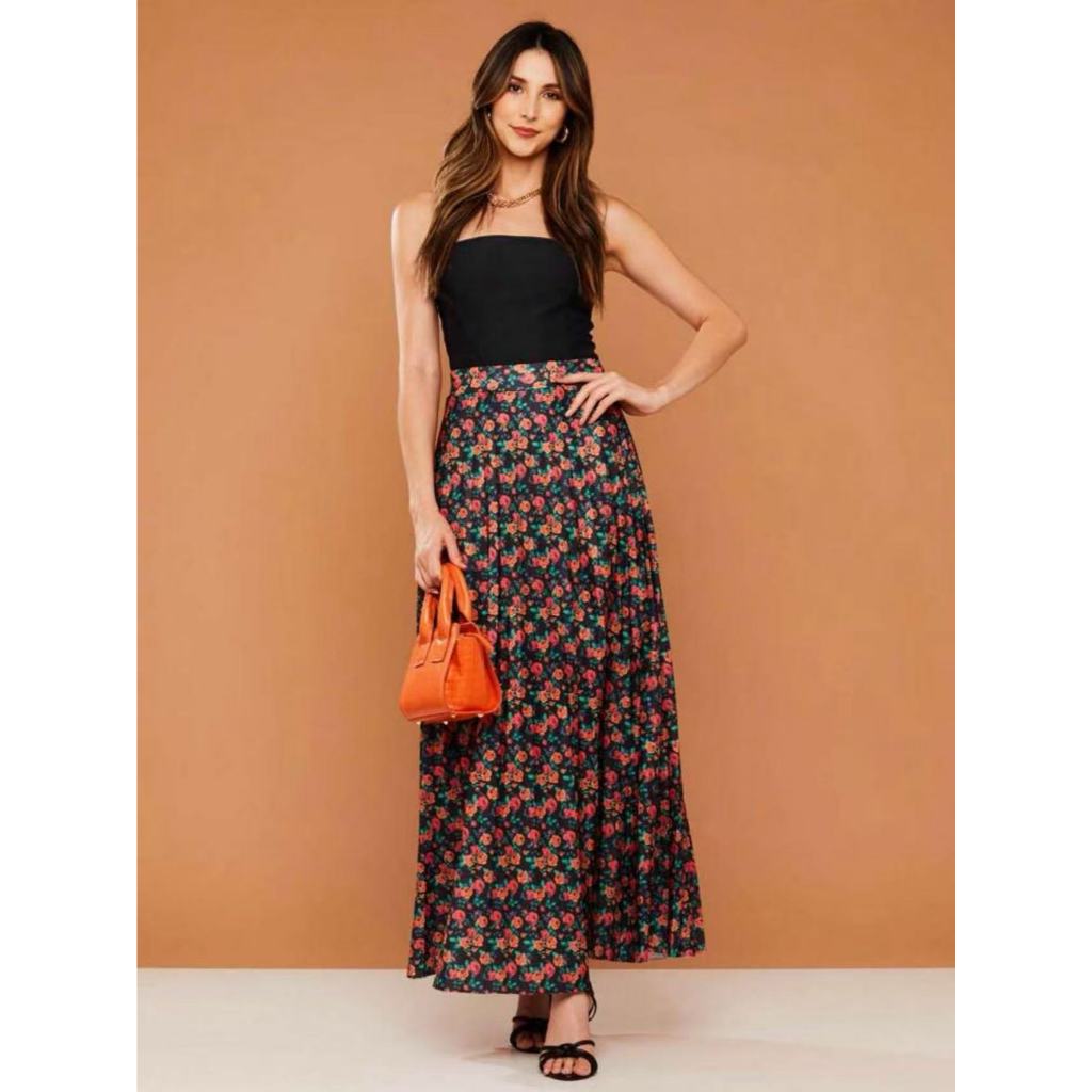 Saia Plissada Longa Evangélica Elegante Cintura Alta Flor-031