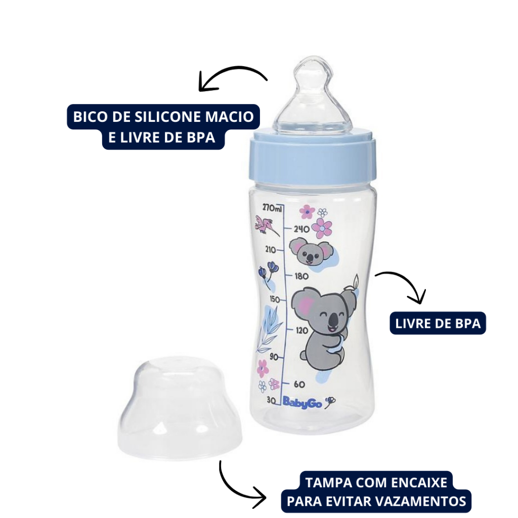 Mamadeira Bico Macio com Tampa Higiênica Azul Coala 240ml BabyGo