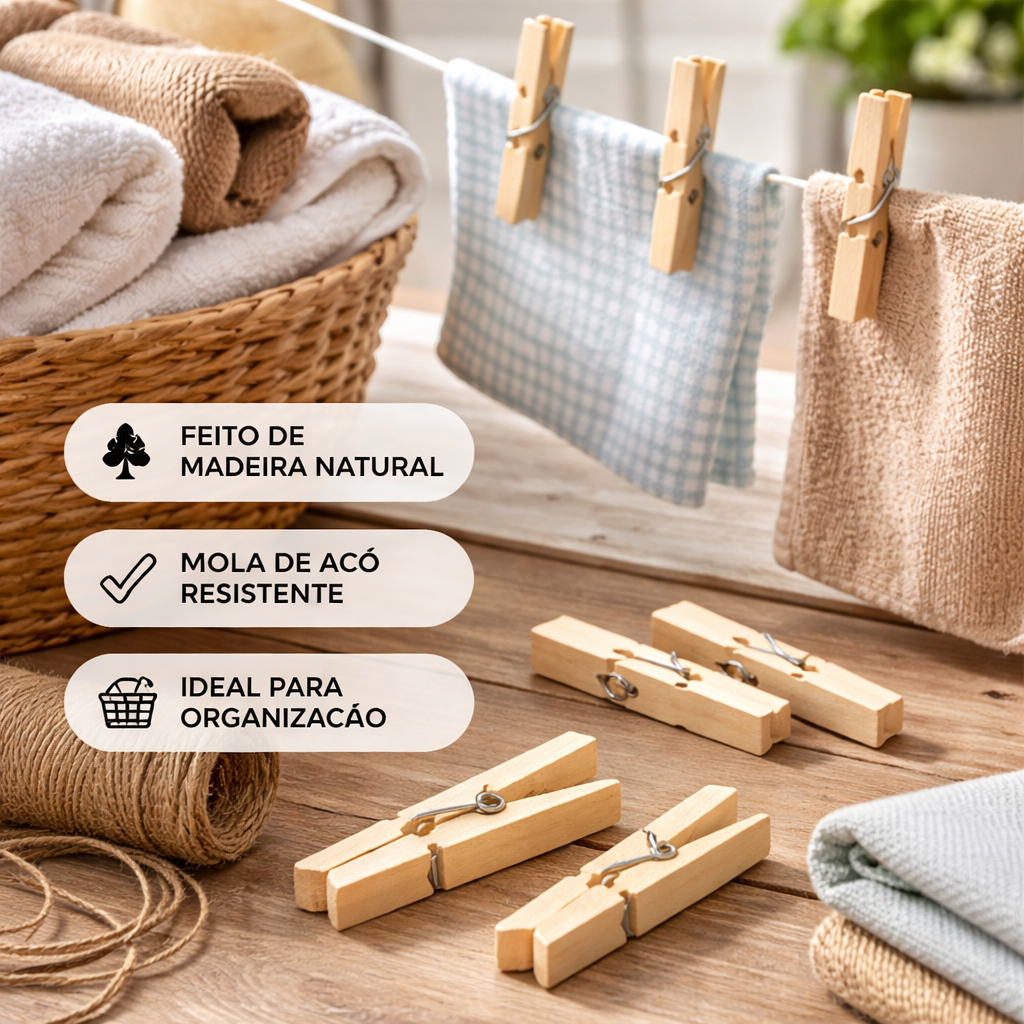Prendedor de Roupa de Madeira Reforçados Kit com 120 Antideslizantes para Varal