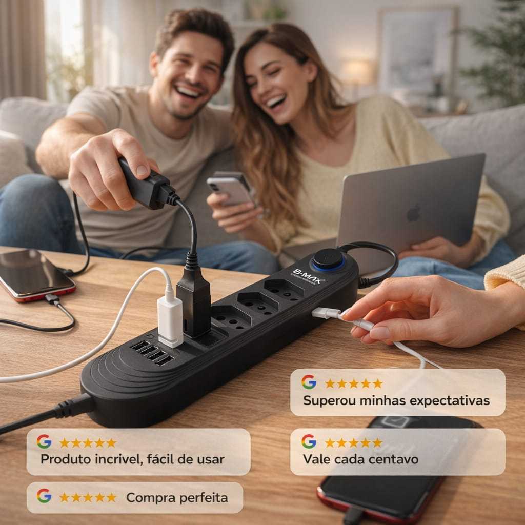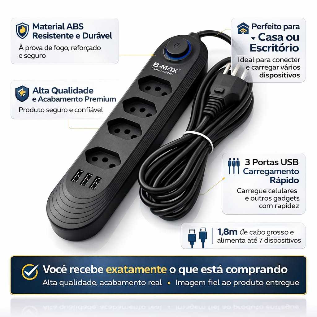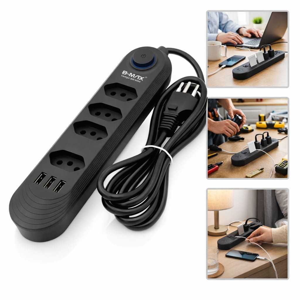 Extensão B-Max Preta 4 Tomadas + 3 USB com Interruptor