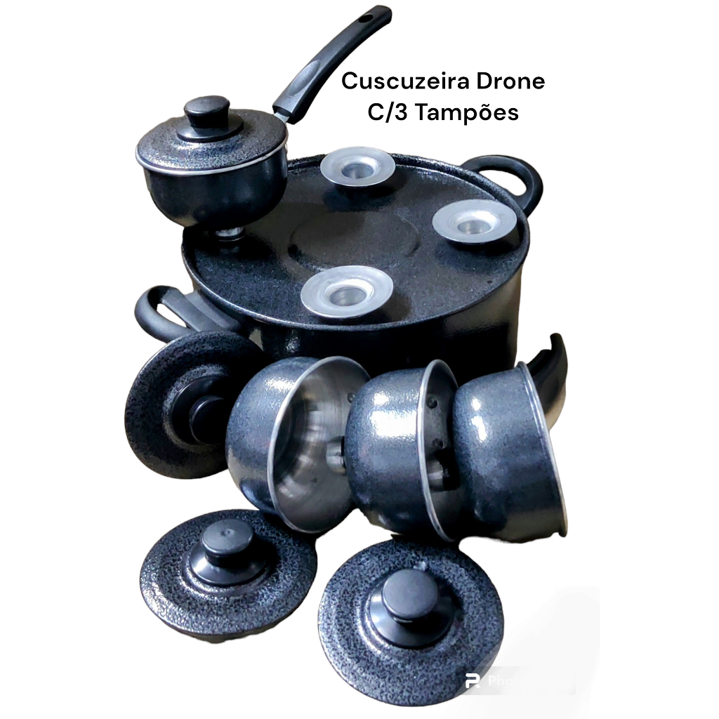 Cuscuzeira DRONE preta 4 em 1 a Original com 3 Tampões Inclusos