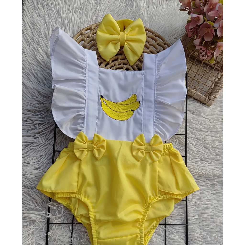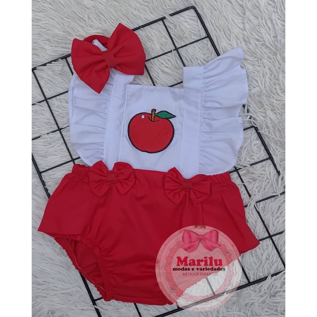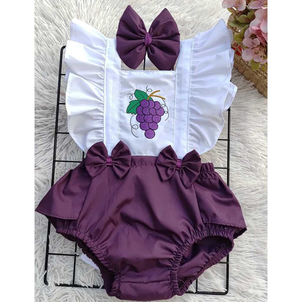 Jardineira romper temático, coleção frutinhas bordadas.